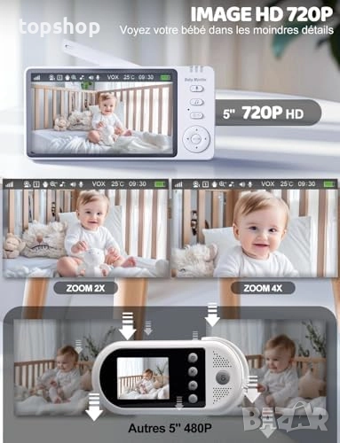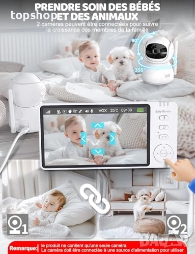HD видео на живо: Бебешкият монитор е с 5-инчов HD 720p IPS екран, който предоставя изключително резки изображения в широка област. С 2x до 4x цифрово увеличение и дистанционно PTZ управление (90° вертикално/355° хоризонтално), можете да наблюдавате фините изражения и движения на вашето бебе от всички ъгли със спокойствие.