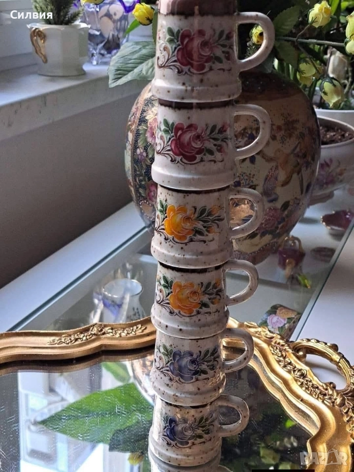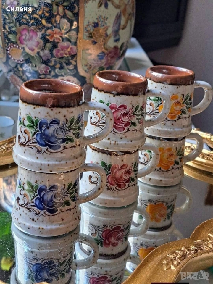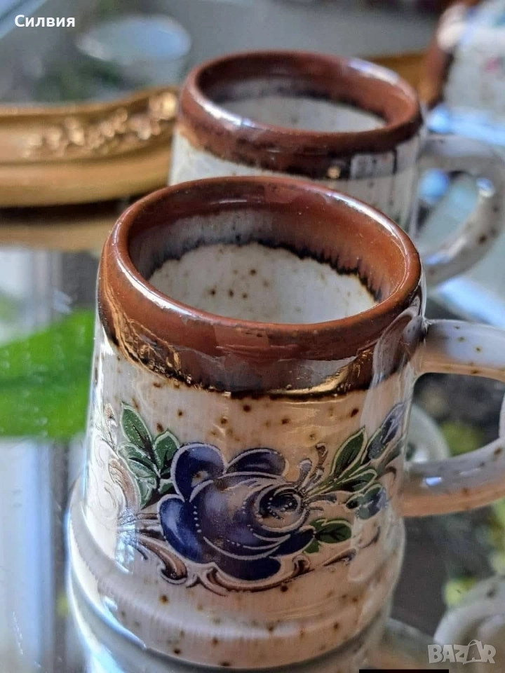 Мини халби с цветен декор и богато украсена ретро керамика. ♦️ Изработени с любов и внимание към детайла, тези сладури, демонстрират красива цветна шарка, вдъхновена от емблематичните баварски дизайни. Ръчно изработени в Германия, те съчетават носталгията по Октоберфест с нотка на женственост, което ги прави много подходящи за декор в кухнята. 🌹 Вместимост почти 30мл. Комплект от 6броя. ❗️Подносът не се продава ❗️ Vintage Germany Flower Beer Stein. ♦️ Независимо дали се ползва по време на празнични събирания или като скъп колекционерски артикул, тази бiрена чашка, добавя уникален и вечен чар към колекцията на всеки любител на бирата.