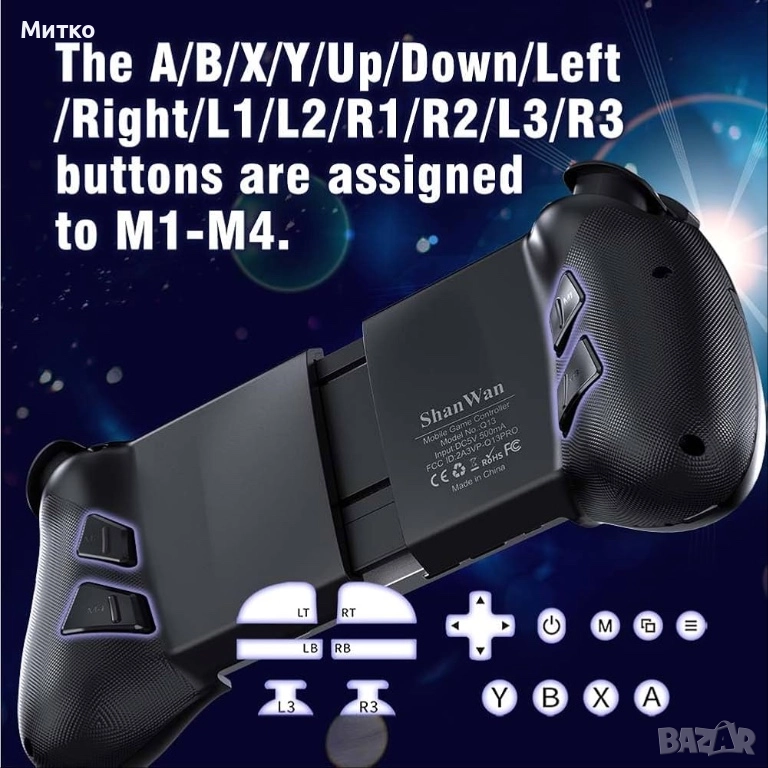 🎮【Големи бутони, персонализируеми бутони】: Мобилният Bluetooth геймърски контролер разполага с по-големи бутони, което го прави по-подходящ за геймъри с по-големи ръце. Можете също така да персонализирате бутоните според личните си предпочитания. Бутоните A/B/X/Y/нагоре/надолу/наляво/надясно/L1/L2/R1/R2/L3/R4 са назначени на M1-M4.
