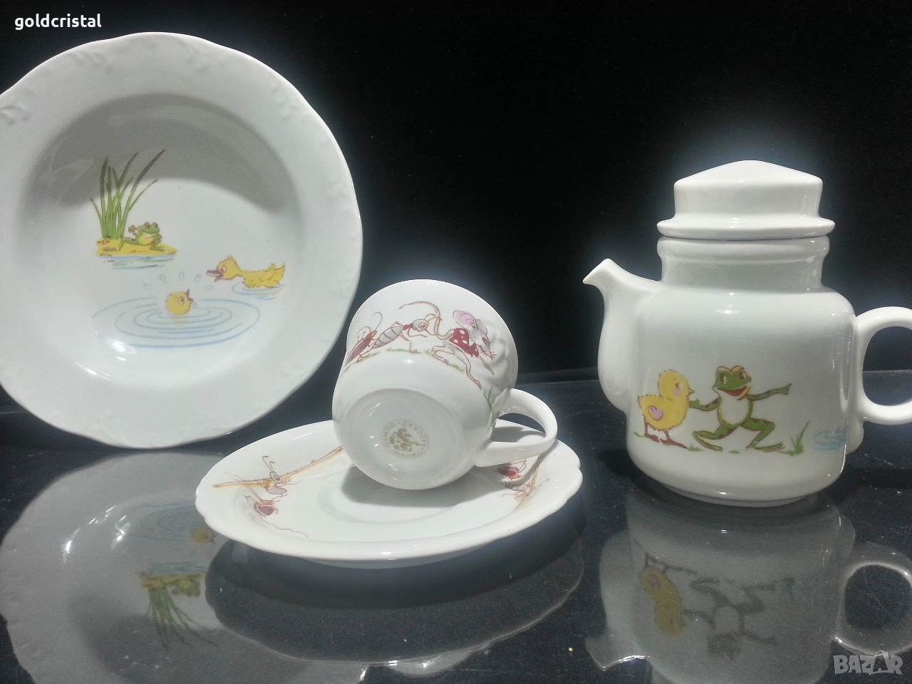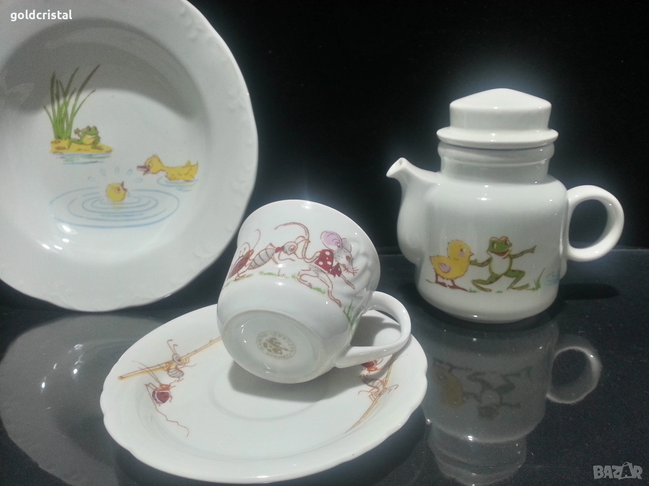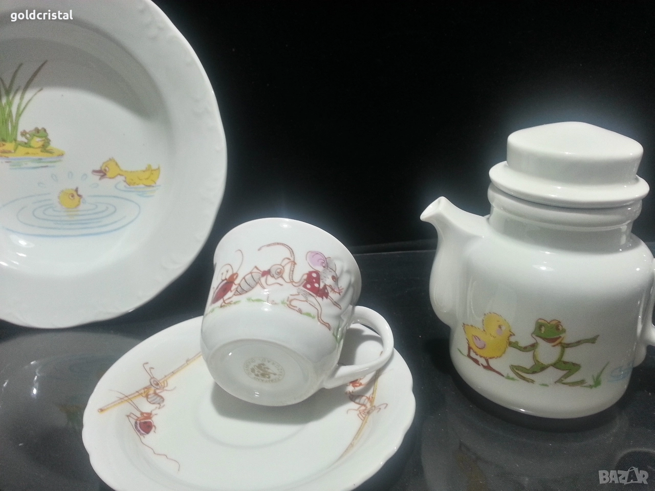 Стар български порцелан Разград дълбока чиния чашка с чинийка и чайниче детски комплект неизползвани сервиз комплект сет лот ретро арт декор винтидж колекция стари старинни антикварни предмети обзавеждане за дома и семейството подходящи за подарък за ценители и колекционери