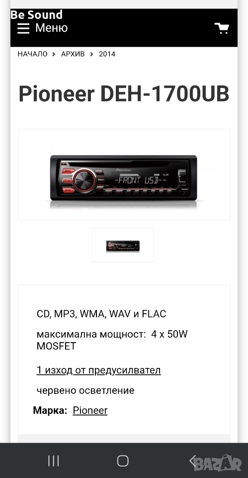аудио устройства чрез преден AUX вход Заглушаване при работа с мобилен телефон Музикален браузър Дисплей Кирилизиран LCD 1 ред с 12 символа Контрол на контраста на 10 стъпки Терминали Aux вход - Фронтален Директно управление към суббуфера Възможност за управление от мулти шатъл / чрез допълнителен адаптер / RCA от предусилвател 1 (Заден или за субуфер) USB преден вход Android Media Съвместим с Android телефони с Android V4.0 или по-нова версия. (За Android V2.3, чрез допълнително приложение Pioneer) Функции • Възпроизвеждане на музика • Зареждане на батерията Аудио Advanced Sound Retriever (ASL) 5-лентов графичен филтър Високочестотен филтър (HPF) Нискочестотен филтър (LPF) Регулатор на нивото на източника (SLA)
