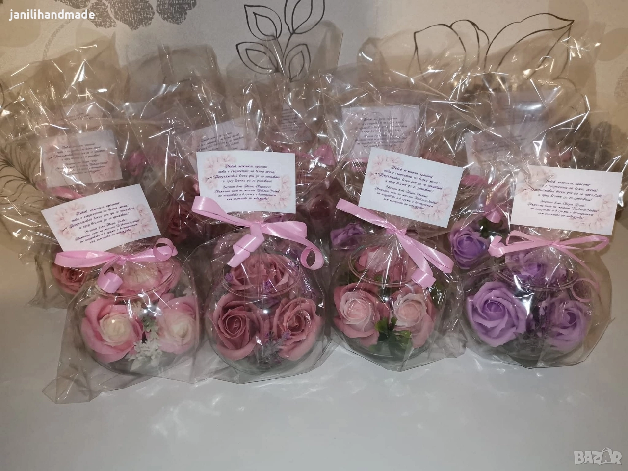 Стъкленици с цветя от пластичен сапун, в опаковка с панделка и текст по избор.