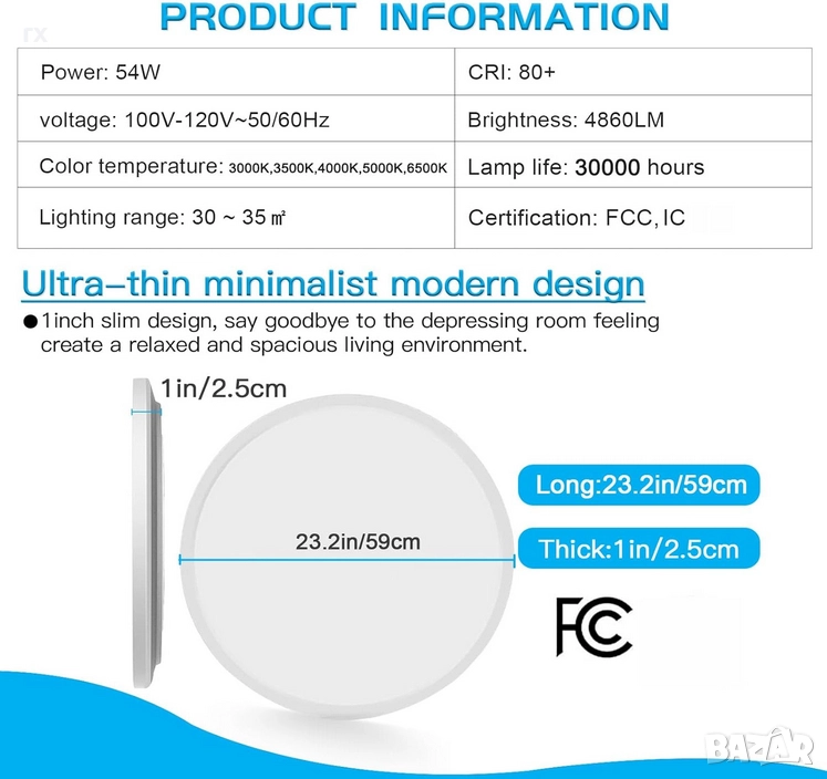 лампа за таван с кръгъл дизайн и диаметър от 60см. С 56w мощност и възможност за регулиране на светлината с дистанционно управление.