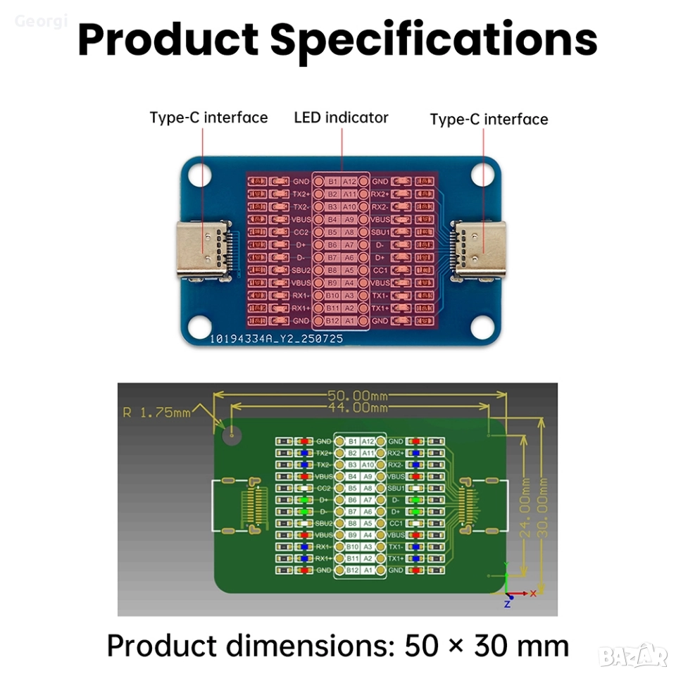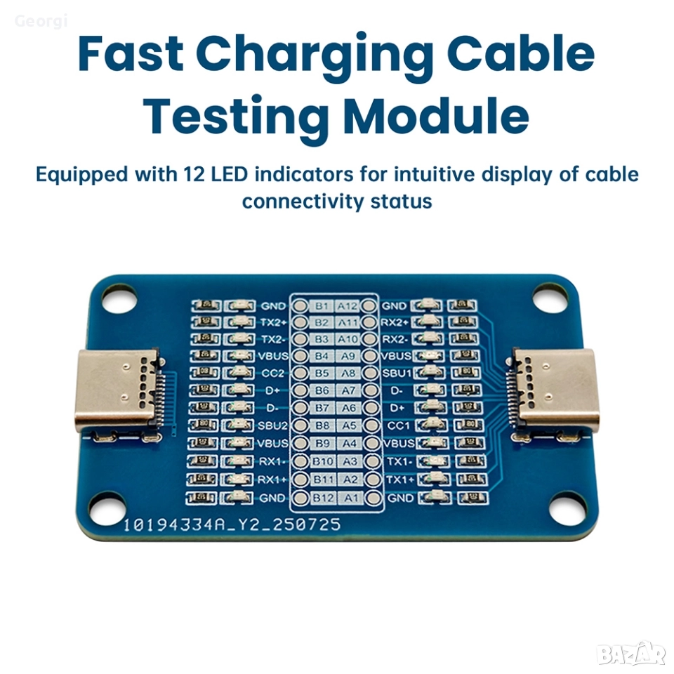 Платката, която виждаш, е проектирана за тестване на USB Type-C кабели, като проверява за прекъсвания и къси съединения във всяка линия. Използва се за бърза диагностика на кабели, за да се гарантира коректна свързаност и зареждане.
