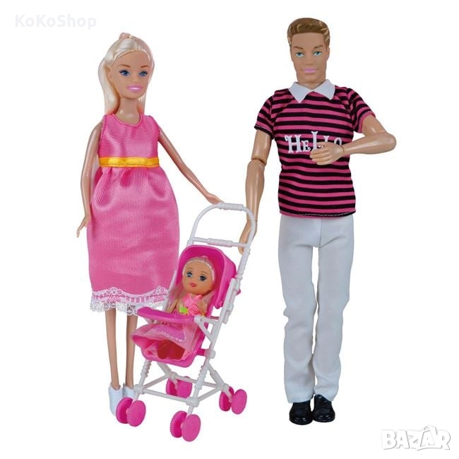 Комплект семейство кукли-бременна майка,баща,малко момиченце и домашен любимец. Момиченцето е в количка,а майката е бременна,като в корема и ще намерите малко бебенце. Комплектът съдържа и различни дребни аксесоари.