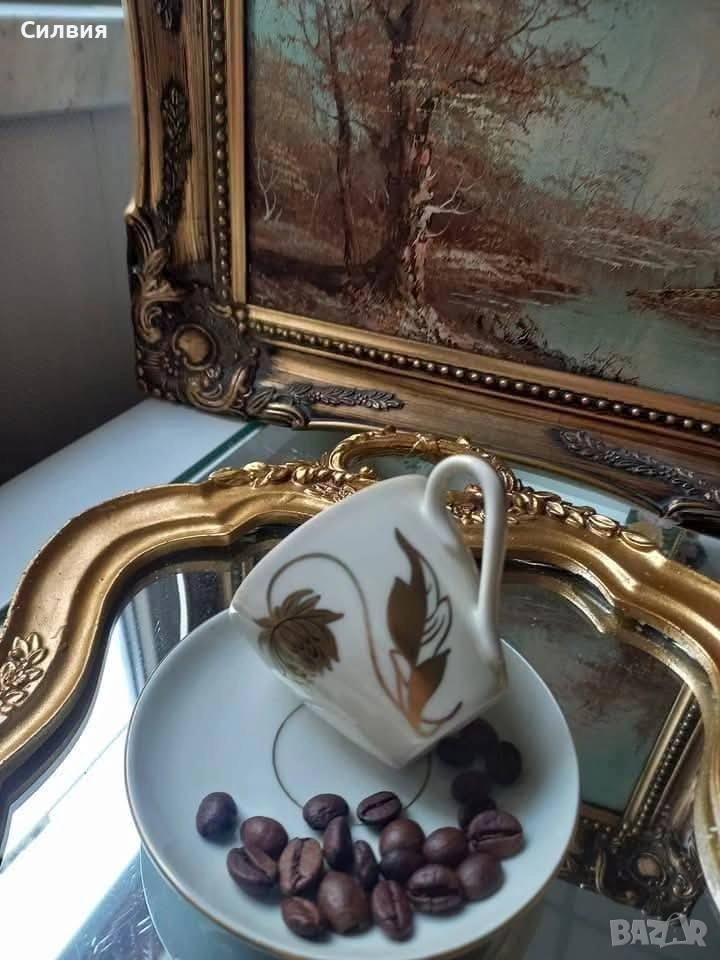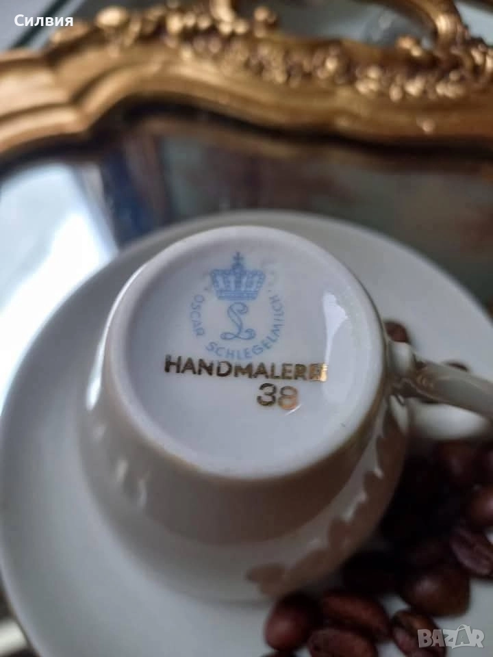 Винтидж *Oscar Schlegelmilch* Мока чаша, ръчно рисуван декор- красиво златно цвете. GDR порцелан Oscar Schlegelmilch 50г. Чаша за късо кафе.Вместимост100мл. Цена 5️⃣5️⃣лв./28,12 €/ ⊱❥─❥⊱💜✿⊱╮☆♪ ░L░o░V░e░❥─❥⊱💜✿⊱╮💜☆♪ღ💜ღ꧂ღ Фабриката е основана през 1891 г. в град Лангевизен, Тюрингия, Германия. Марката "Crown L" с корона и инициал "L" е използвана между 1950 и 1972 г.