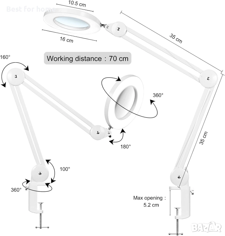 【Радиус на работа 90 см】Главата на лампата се регулира чрез завъртане на 360° и достига до 90 см вертикално и хоризонтално.