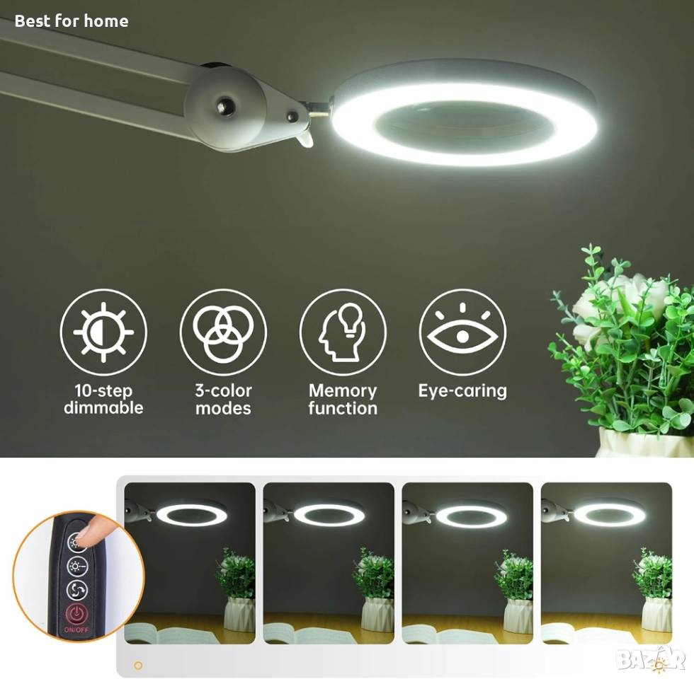 LED лампа с лупа Beyamz, метално въртящо се рамо, светлини в 3 цвята и леща с 5 диоптъра