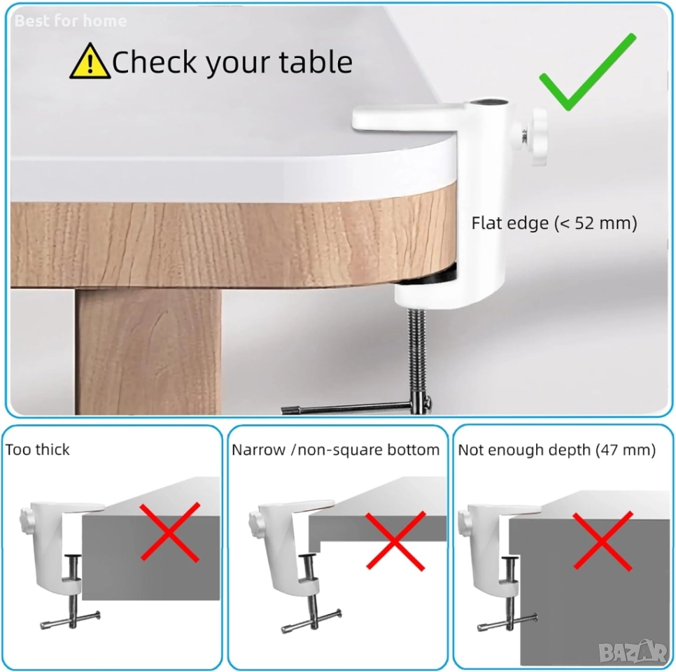 【Стабилна стойка, пестяща място】 Закрепена към квадратен ръб с дебелина до 5 см, лампата спестява място на вашето бюро, работна маса или маса. Гумените възглавници осигуряват защита от двете страни на бюрото.