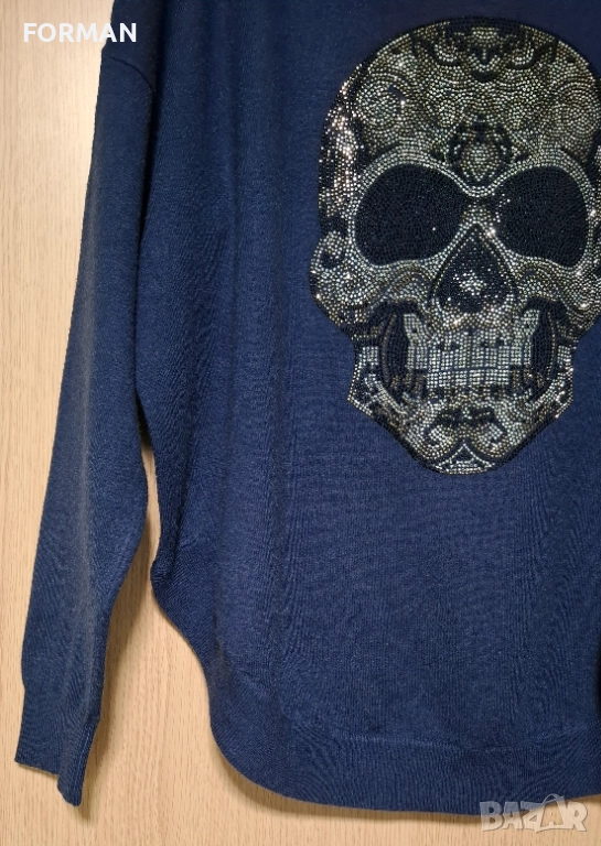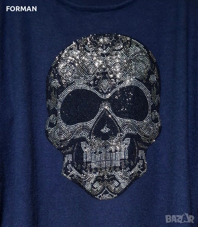 Тъмносиня блуза от фино плетиво с череп от сребристи камъчета → Обява 52926348