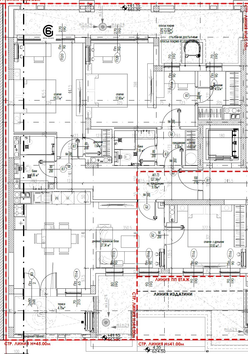 Разпределението е следното: антре/коридор, дневна с кухненски бокс и трапезария, три спални, две бани с тоалетна, два дрешника, и две големи тераси с уникална гледка.