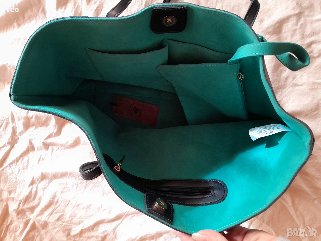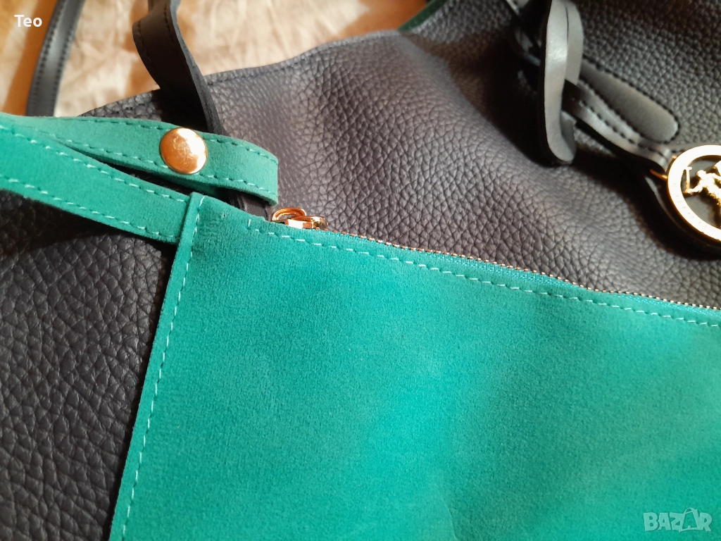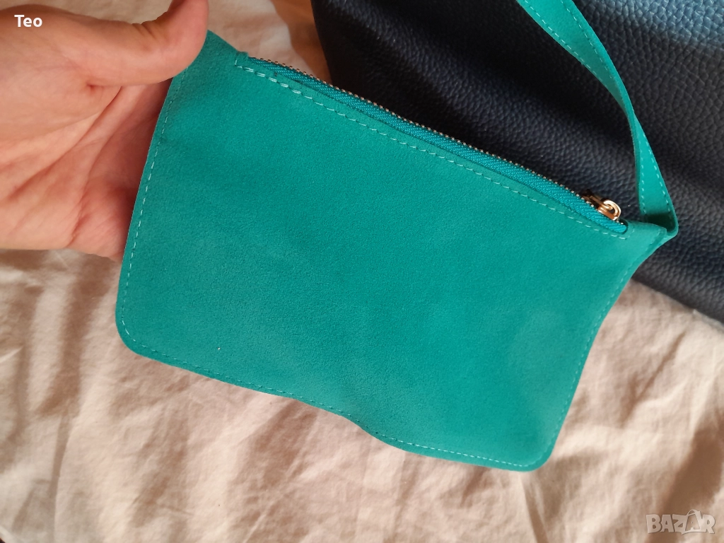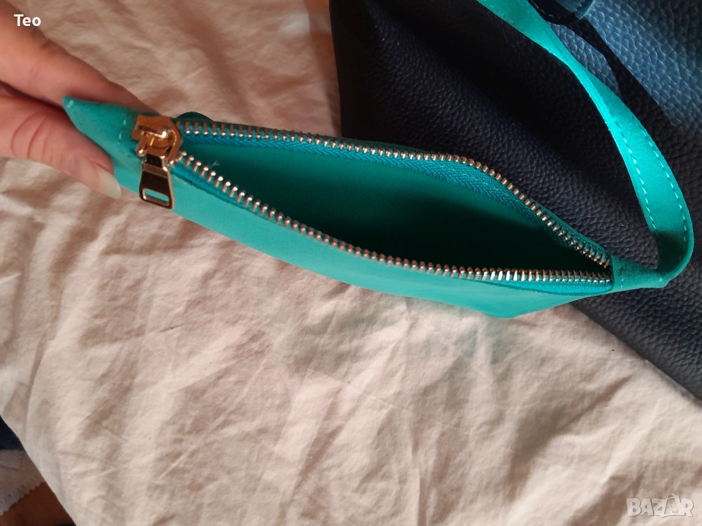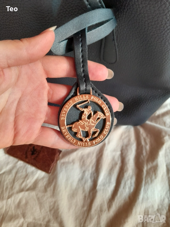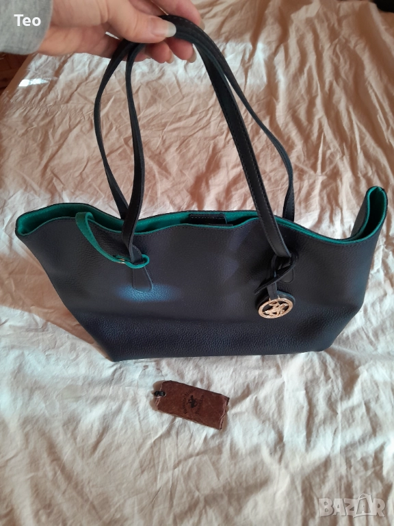 Чанта от Beverly Hills Polo Club в много тъмносин цвят, почти като черно. Към нея има несесер, както и логото на марката. Чисто нова. Красива изработка, стои много стилно. Отвътре е в тюркоазен цвят. Закопчава се с магнит, отвътре има две прегради без цип и един джоб с цип, както и несесерът, който е с цип.