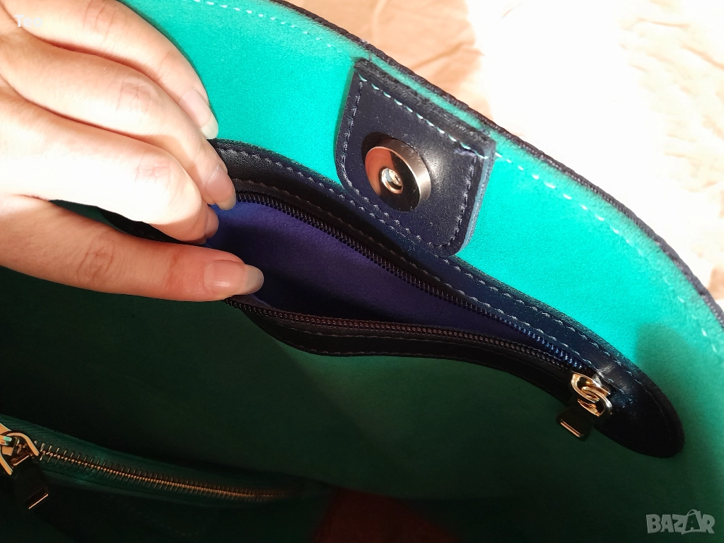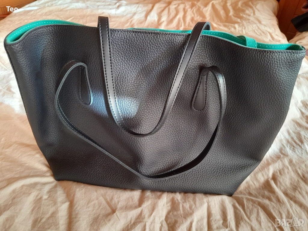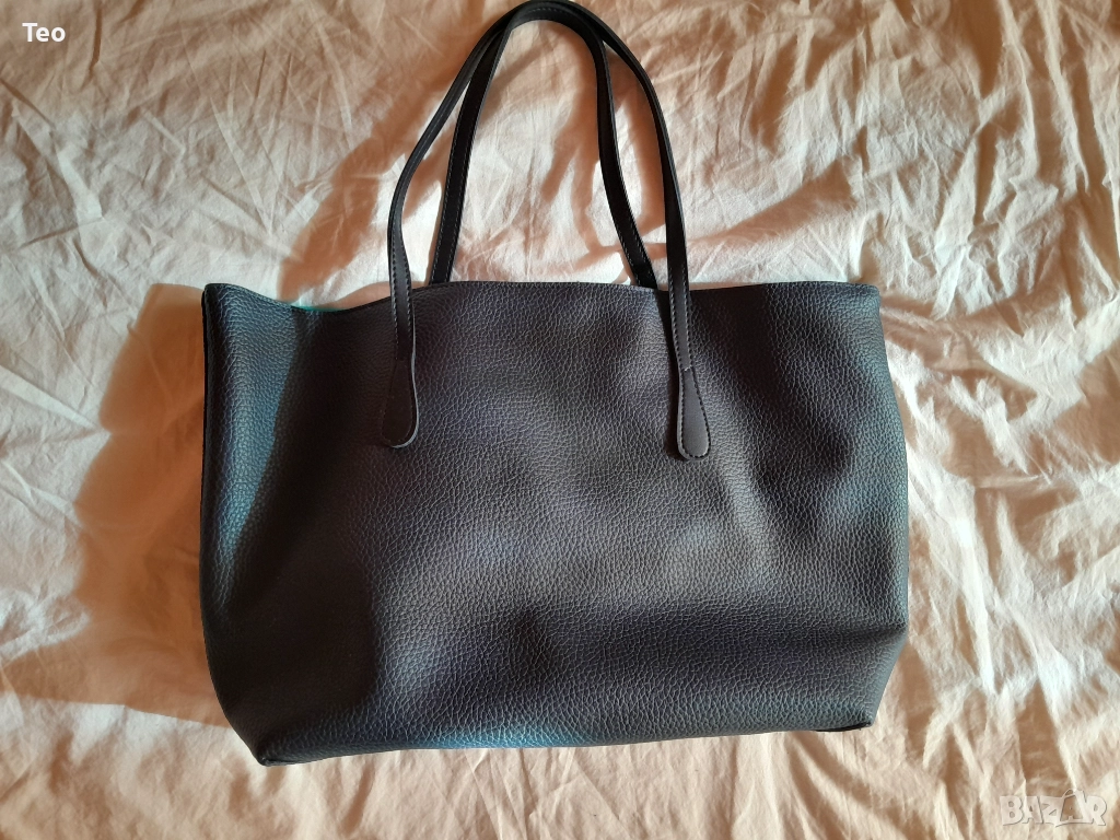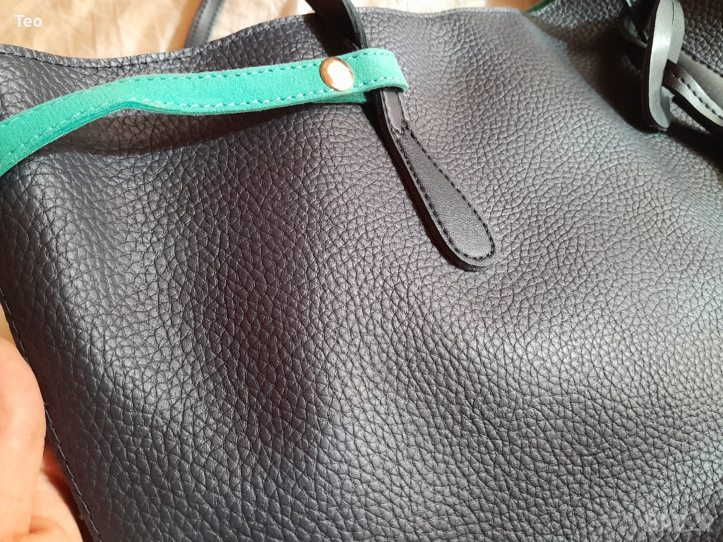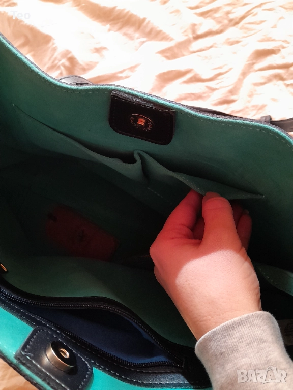 Чанта от Beverly Hills Polo Club в много тъмносин цвят, почти като черно. Към нея има несесер, както и логото на марката. Чисто нова. Красива изработка, стои много стилно. Отвътре е в тюркоазен цвят. Закопчава се с магнит, отвътре има две прегради без цип и един джоб с цип, както и несесерът, който е с цип.