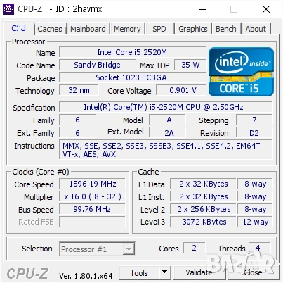 Intel Core i5-2520M Processor (3M Cache,2/4x.2.50/3.20GHz,PPGA988)