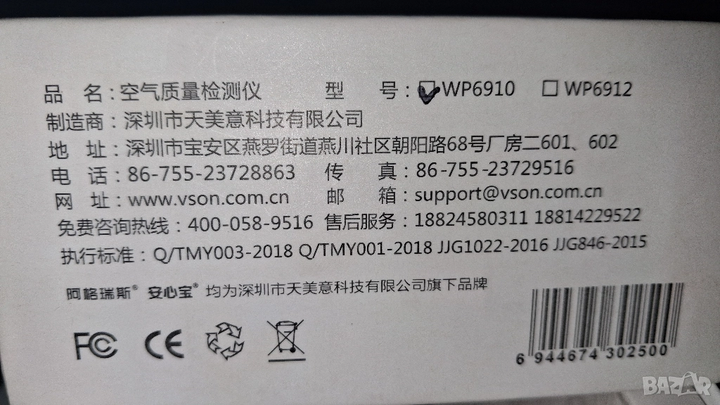 Монитор за качество на въздуха WP6910 (PM2.5, HCHO, TVOC)