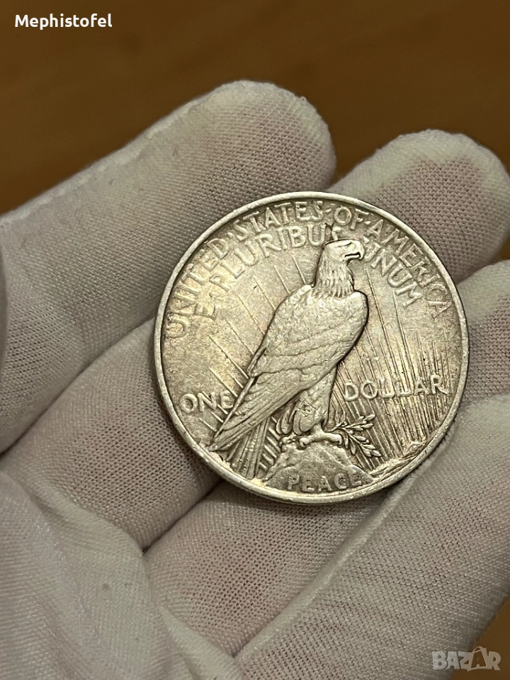 Стара и голяма сребърна монета - сребро проба 0.900, каталожно тегло 26.73 грама, диаметър 38.1 мм, назъбен гурт. Peace Dollar, матричен гланц и отличен релеф.