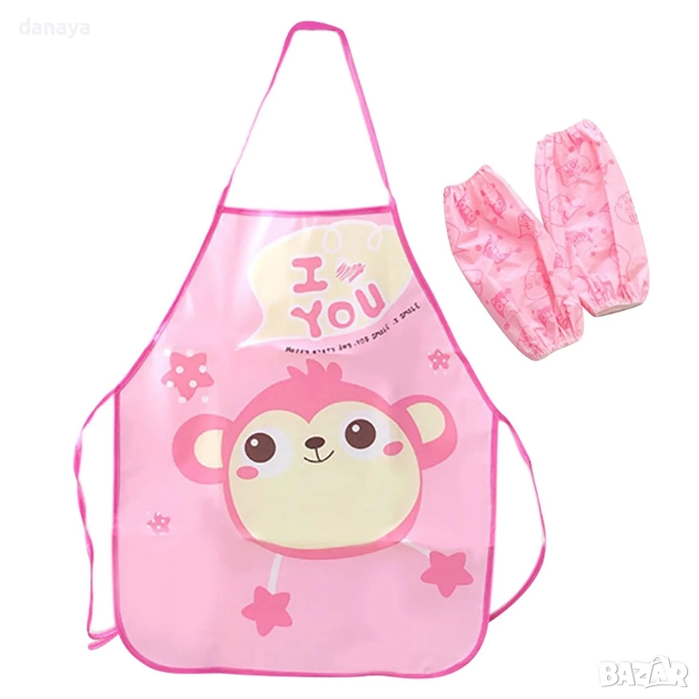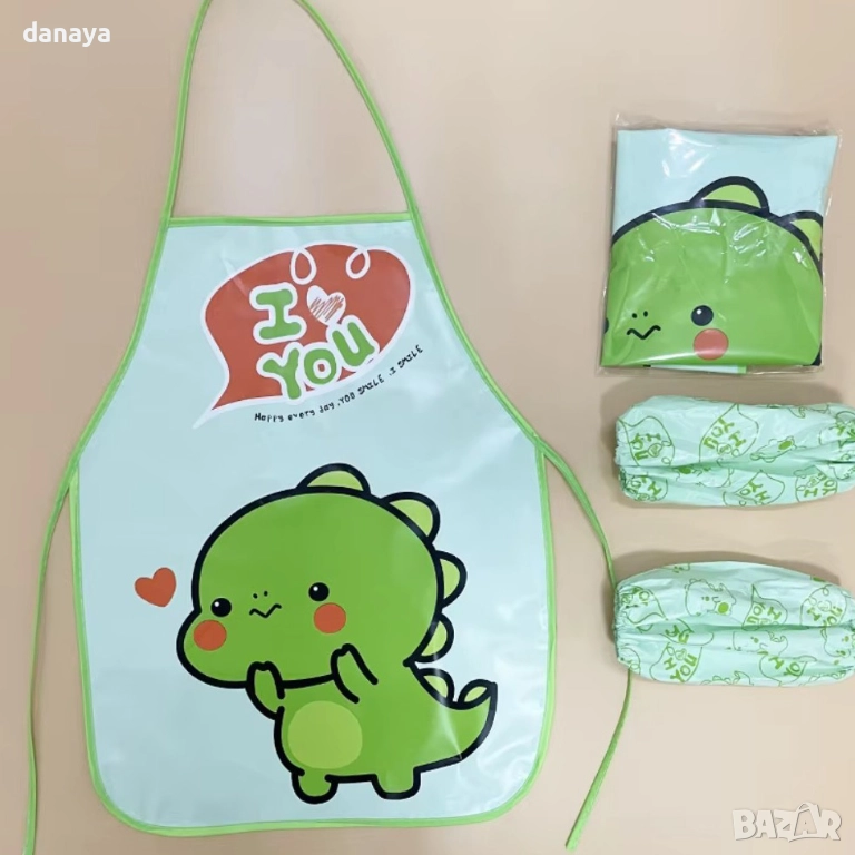 Комплектът включва престилка и отделни защитни ръкави с ластик, които покриват ръцете и предпазват ръкавите на дрехите по време на рисуване. Материалът не попива течности и се почиства изключително лесно – просто се избърсва с влажна кърпа. Ярките цветове и веселите животински изображения правят престилката привлекателна за децата и превръщат рисуването в истинско удоволствие.