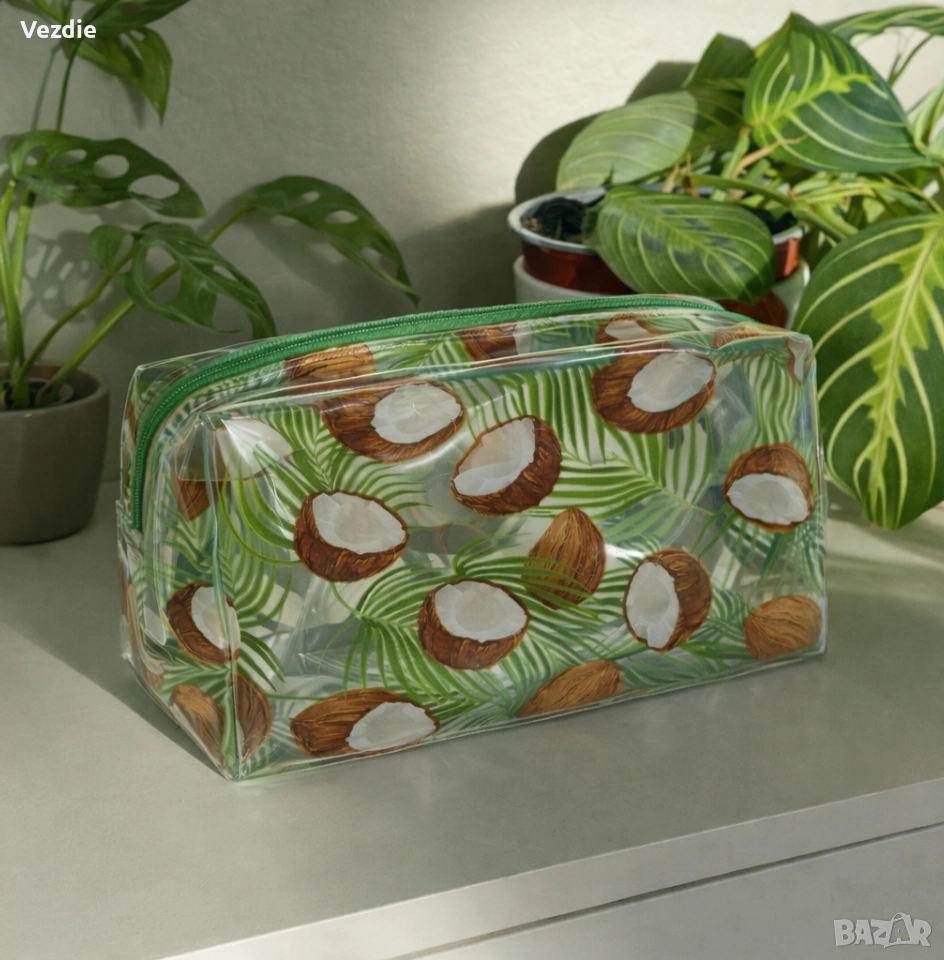 Прозрачен козметичен несесер с тропически дизайн с кокоси и палмови листа. Подходящ за козметика, пътуване или ежедневна организация. Стилен, лек и лесен за почистване.