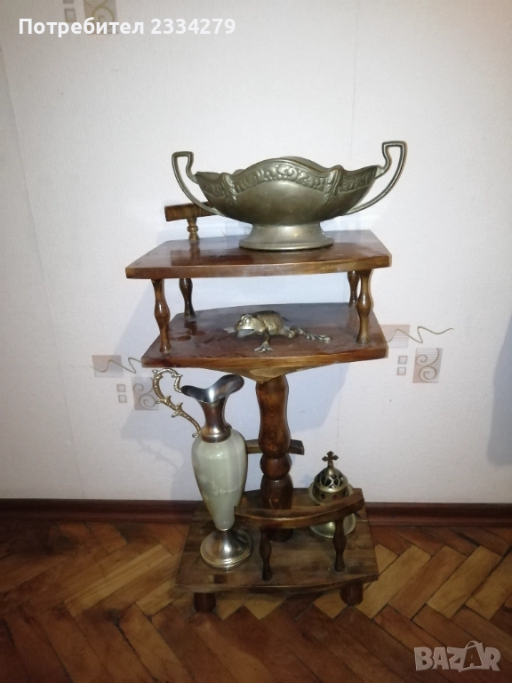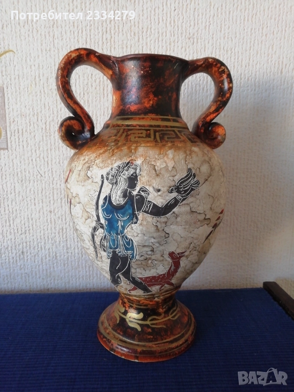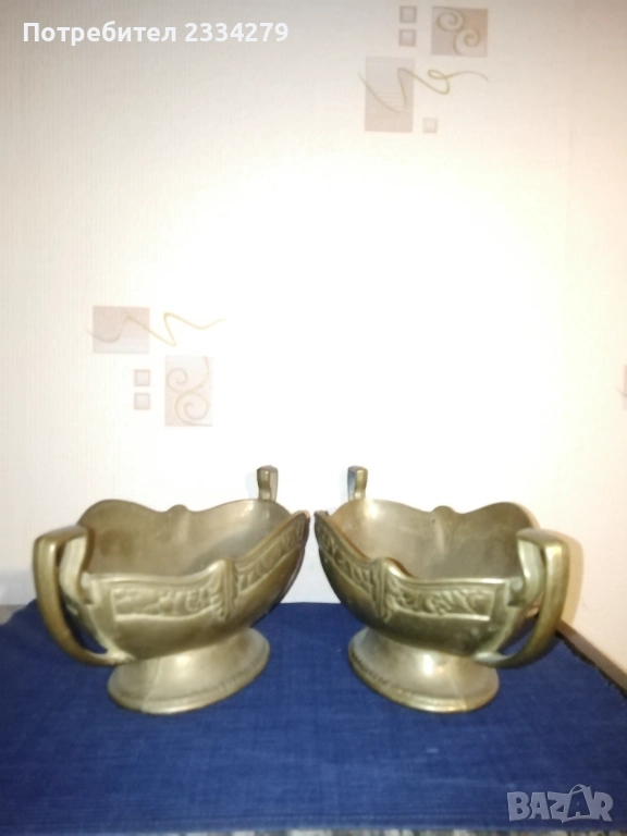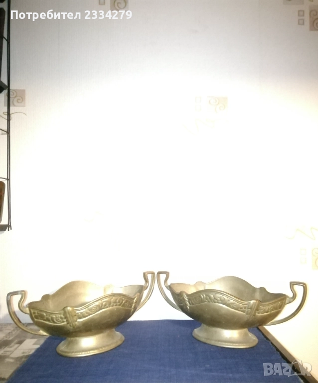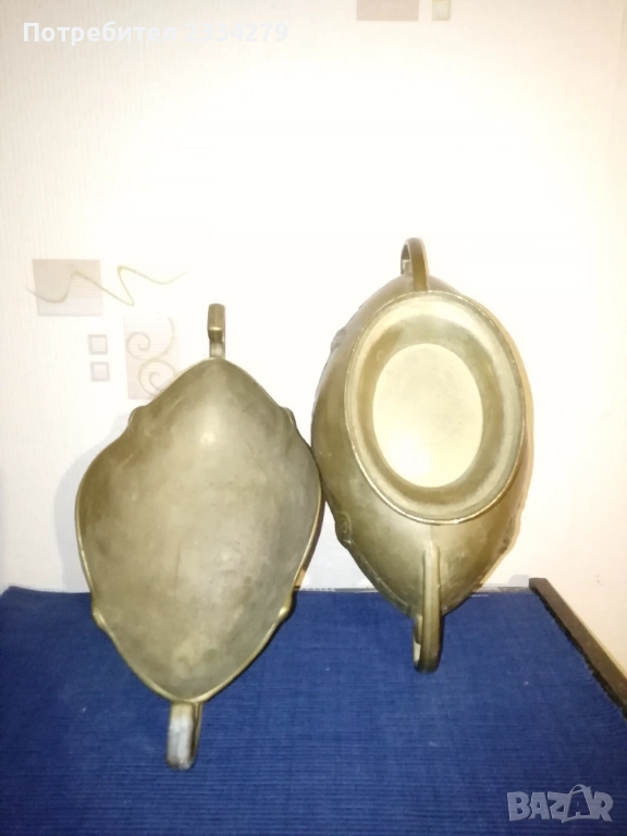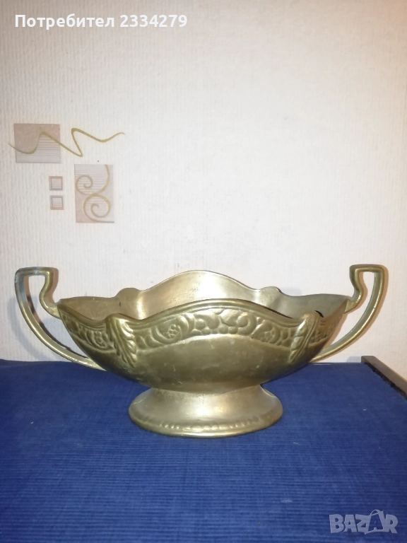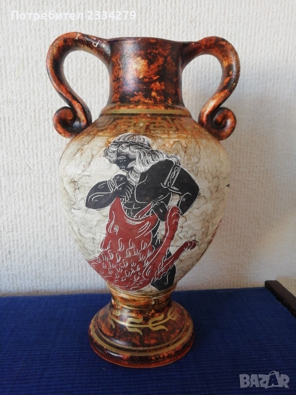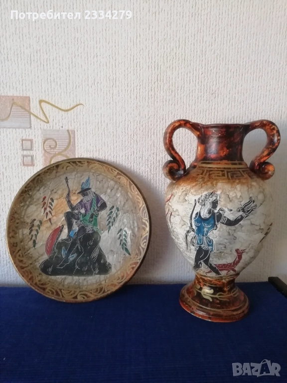 Жардиниера тип гондола богато украсена, централна украса, ръчна отливка от масивен бронз-месинг във Венециански бароков стил, размери: дължина 33см., широчина 17см.,височина 13см., тегло на едната 1кг.450гр., цена за брой 15€. Красива декорация или ползване за купа на плодове или саксийник с дръжки. N:2 класически глинени-керамични декорации: масивна гръцка ваза с красиви мотиви и сцени от гръцката митология размери 25х15см., ръчно изработена и оцветена от 90-те години, цена 15€.; Декоративна чиния за стена и декорация, гръцки мотив, ръчно изработена има отзад инициали на автор, размер диаметър 21см., цена 3€