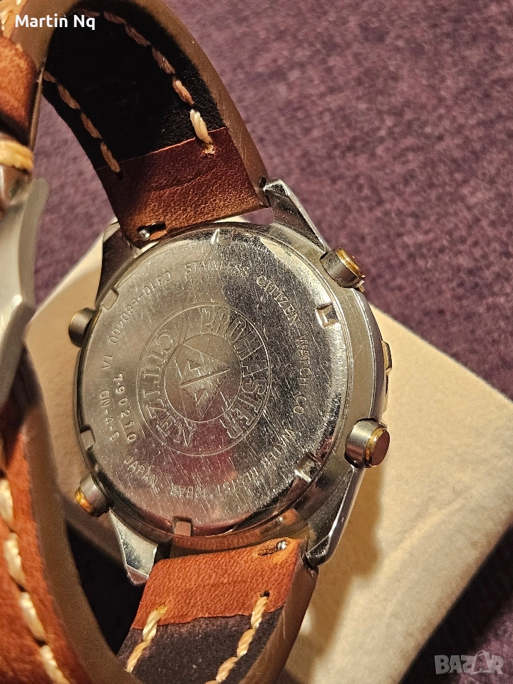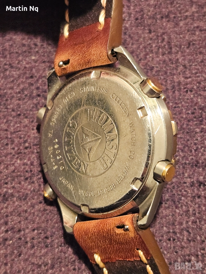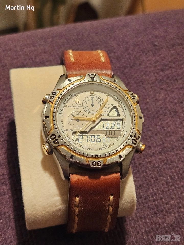 Часовник за ценители на марката Citizen Promaster C310-E80460 хронограф, ана-диги. Размер на касата 41мм. В много добро състояние, без забележки по стъклото. Всички функции работят. Еднопосочен базел 60 клика. Водоустойчив на 100м. Луминисцентно покритие на стрелките и маркерите.