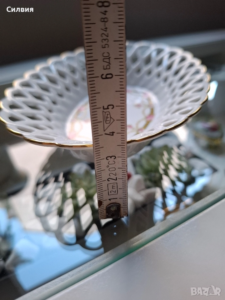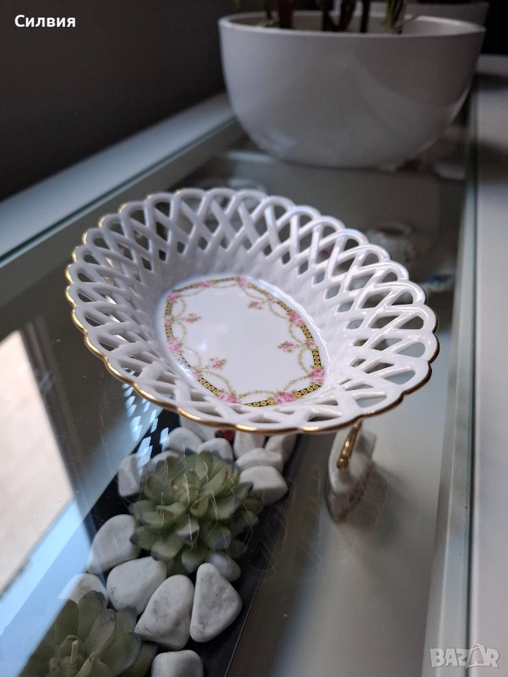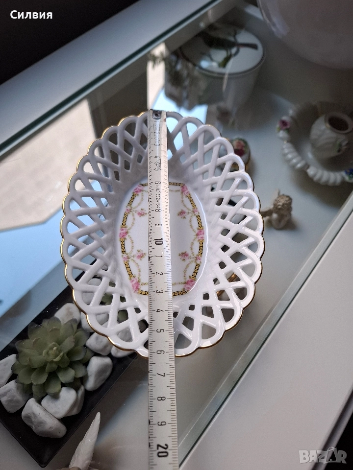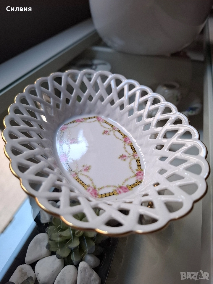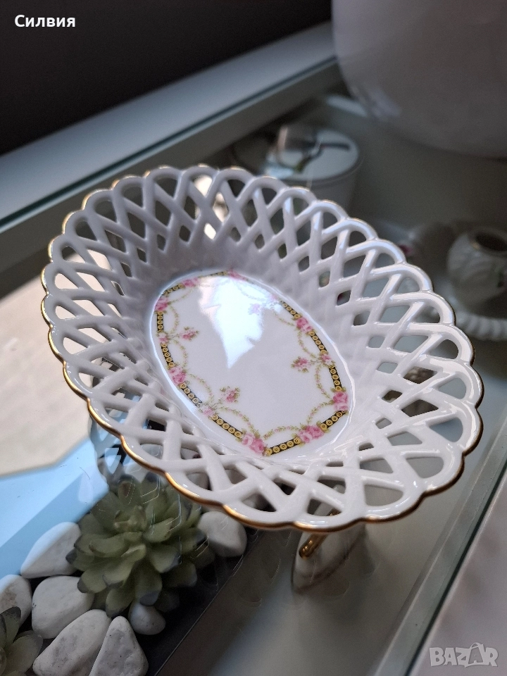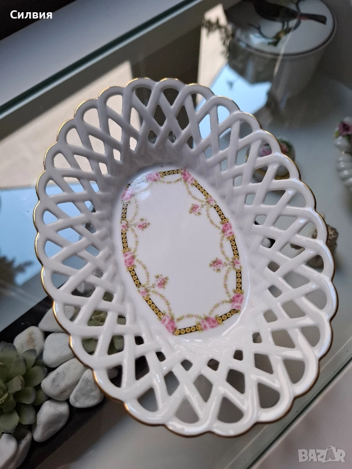 порцелан, тя носи духа на една от най-старите и престижни фабрики в Бавария – Königlich priv. Tettau (основана през 1794 г.). Купата е с впечатляваща ажурна (перфорирана) плетка по борда, която придава лекота и въздушност на съда. Ръбът е подчертан с фина позлата, която добавя елегантност и лукс. Дъното е украсено с нежен флорален мотив – гирлянди от розови рози, преплетени със златни детайли и класически орнаменти в черен и златист цвят. На дъното е поставен печатът на Königlich pr. Tettau, придружен от надписа "Tettau Atelier". Тази марка обозначава художествения отдел на компанията, където се създават изделия с по-висока художествена стойност, често включващи ръчна декорация. Размери: 16 см (дължина) x 12 см (ширина) x 3,5 см (височина). Защо е специална? Марката "Tettau Atelier" е гаранция за качество и детайлност. Този тип съдове са били изключително популярни в европейските аристократични домове и днес се ценят високо от колекционерите заради своята деликатност и непреходна красота. Състояние: Отлично, без чипове, пукнатини или износване на позлатата. Цена 29,65 € (58лв)
