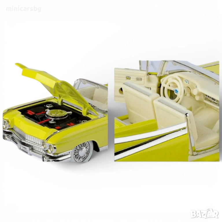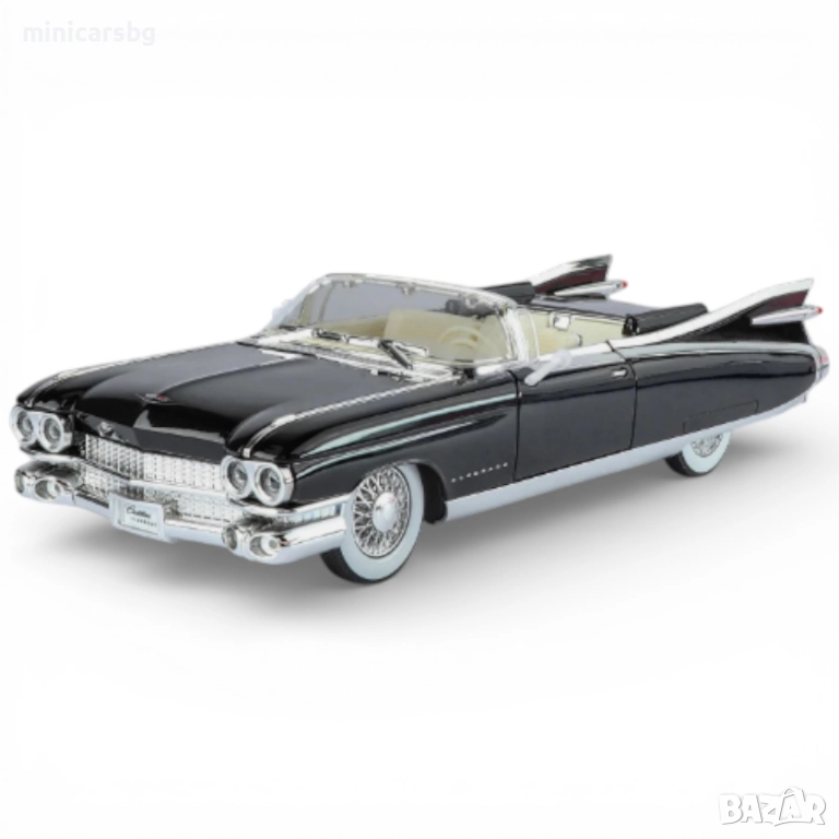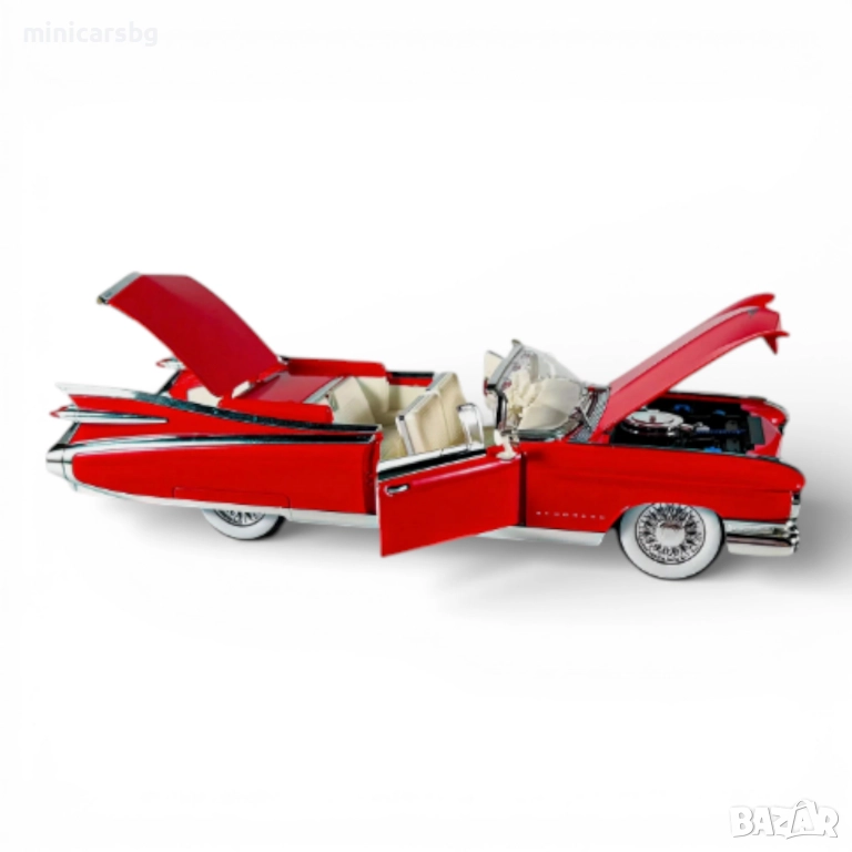 Стилен метален ретро кабриолет в класически Cadillac Big Rocket стил – перфектен макет за витрина, рафт или подарък на фен на старите американски коли. Мащаб по кутия е 1:18, дължина около 23.8 см – голям, тежък и внушителен модел.