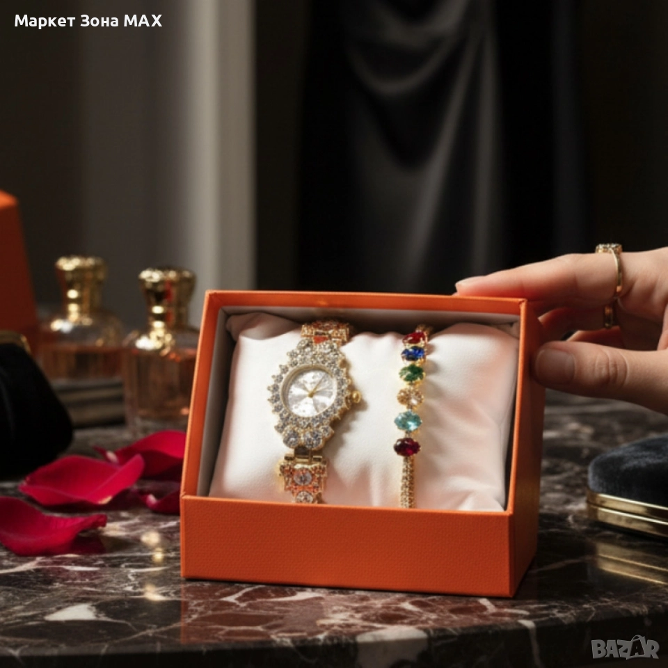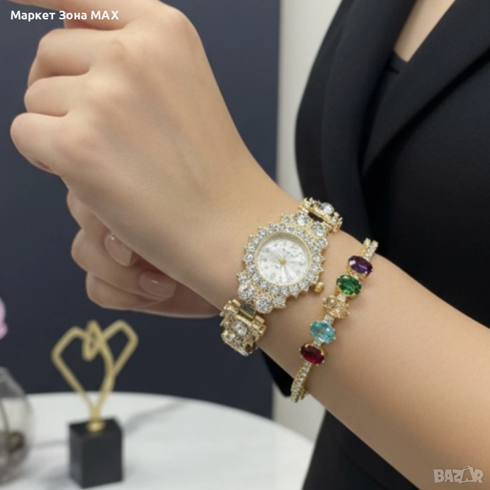 Луксозен дамски комплект – часовник с кристали + гривна с многоцветни камъни