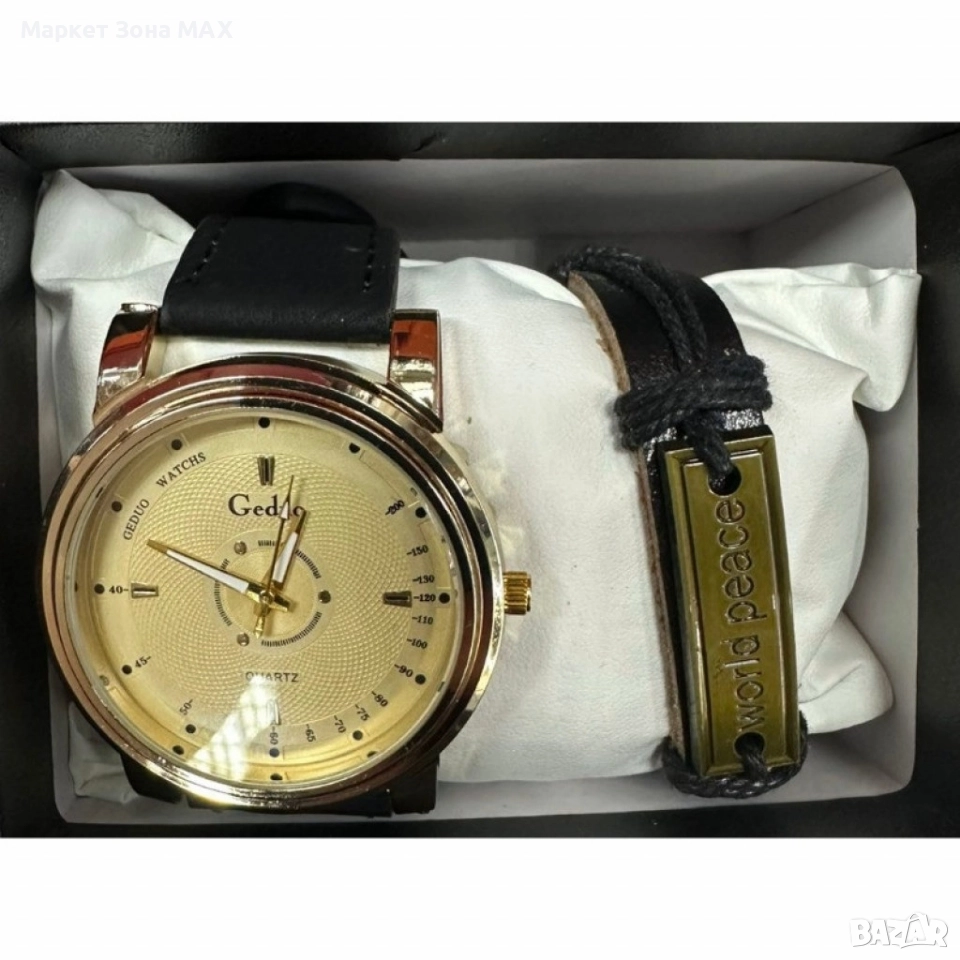 В комплекта: часовник + текстилно-кожена гривна с метална плочка и надпис „World Peace“ (превод: „Световен мир“) + подаръчна кутия;
