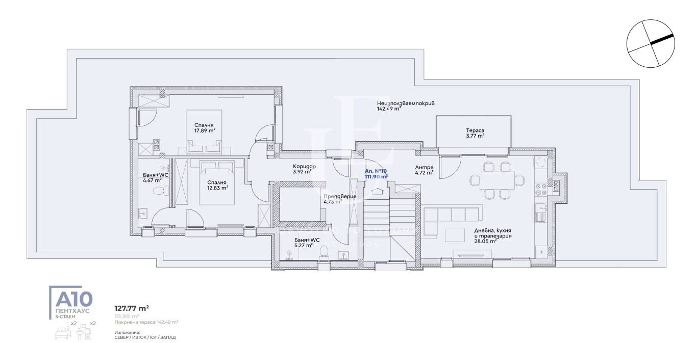 Пентхаусът се състои от хол с трапезария и кухня, 2 спални, 2 бани с тоалетни и тераса. Ref. ID:28433