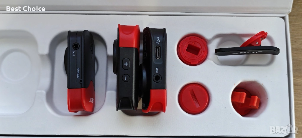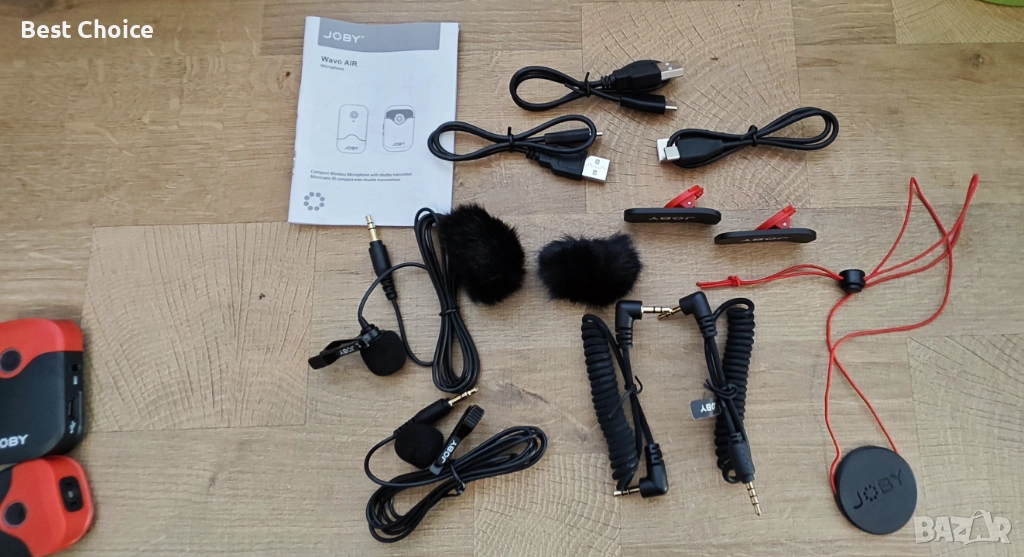 - Комплектът включва: Два предавателя (с вградени микрофони), един двуканален приемник, два външни микрофона тип "брошка" (lavalier) с предпазители срещу вятър (windjammers) и различни аксесоари за монтаж