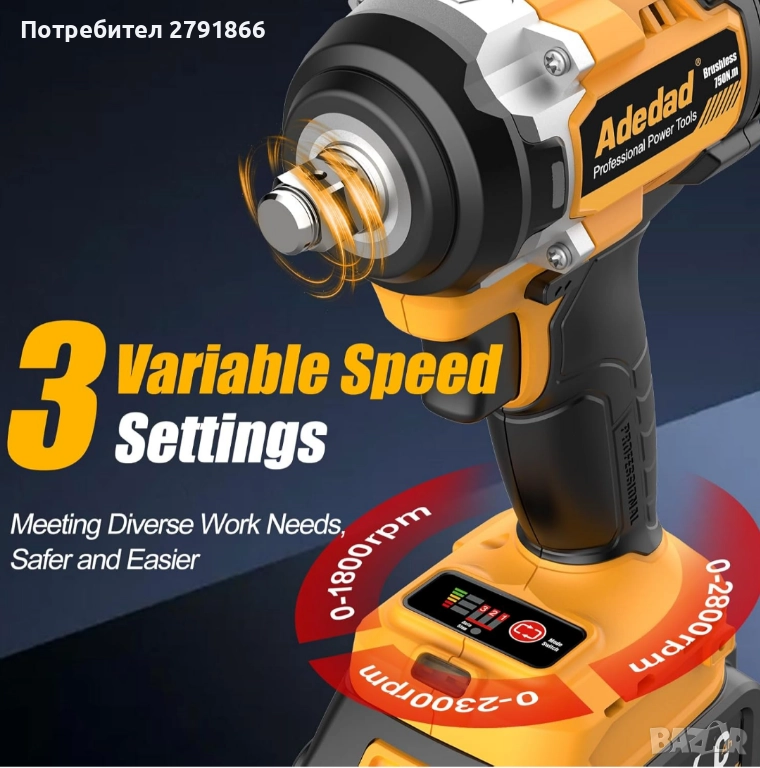 - Висок въртящ момент за тежки приложения - Ударният гайковерт Adedad разполага с впечатляващите 750 Nm въртящ момент, осигурявайки мощността, необходима за лесно справяне с твърди, тежки болтове и крепежни елементи. Независимо дали работите по автомобилни ремонти, строителни проекти или промишлени задачи, този висок въртящ момент гарантира, че можете да се справите дори с най-упоритите инструменти, без да се потите.