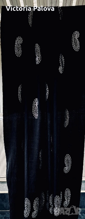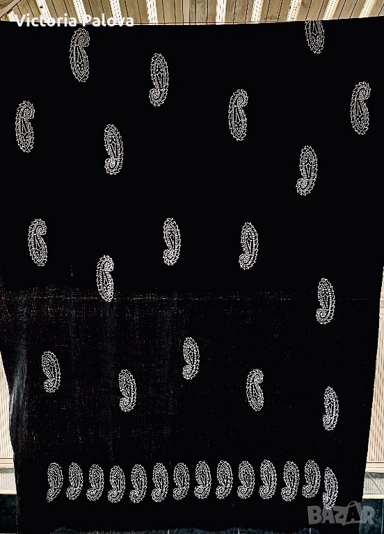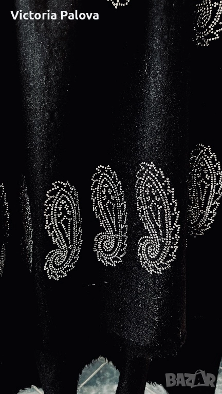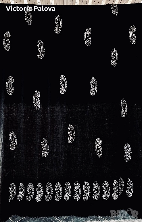 Изключителен шал, който комбинира класическа изработка с модерен блясък, от висококачествена вълна в дълбок черен цвят, той предлага топлина и мекота. Уникален дизайн с пейсли мотиви - извити елегантни форми, които “падат” грациозно по повърхността като звезден дъжд. Всяка пейсли е декорирана с блестящи камъчета, които отразяват светлината и създават искрящ ефект. В горната част мотивите са по- редки за динамичен вид, докато в долната част се подреждат в плътен ред близо до ръба, добавяйки изтънчен завършек. Перфектен за официални събития, вечерни излизания или ежедневен изискан стил. Големите размери - 210см на 105см- позволяват различни начини на носене - като шал, пончо или дори декорация за дома.