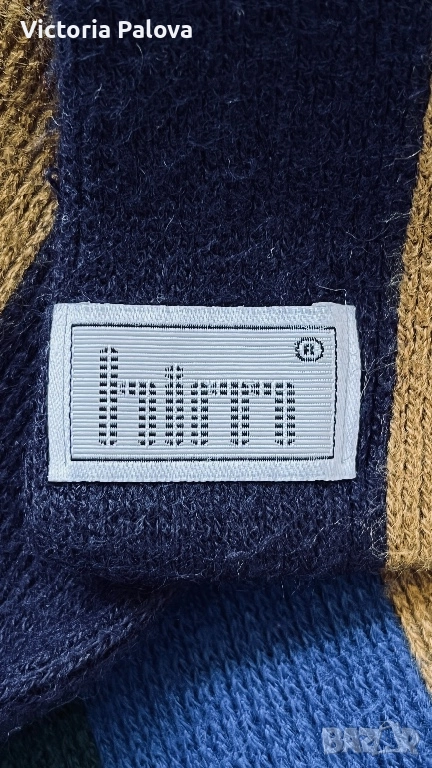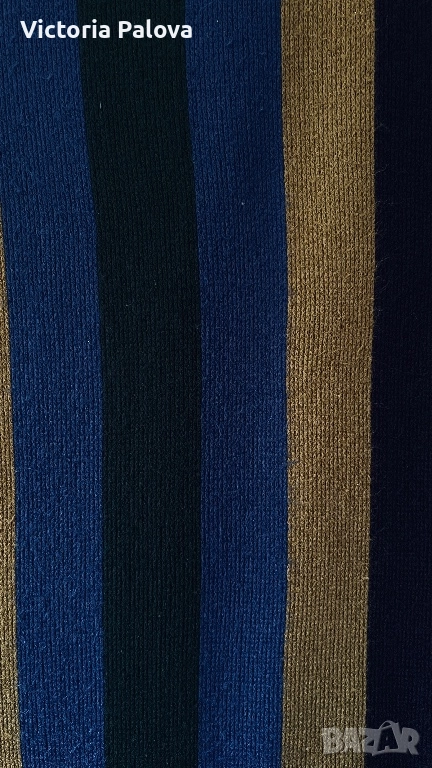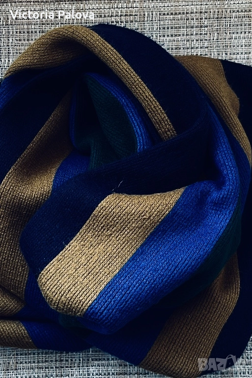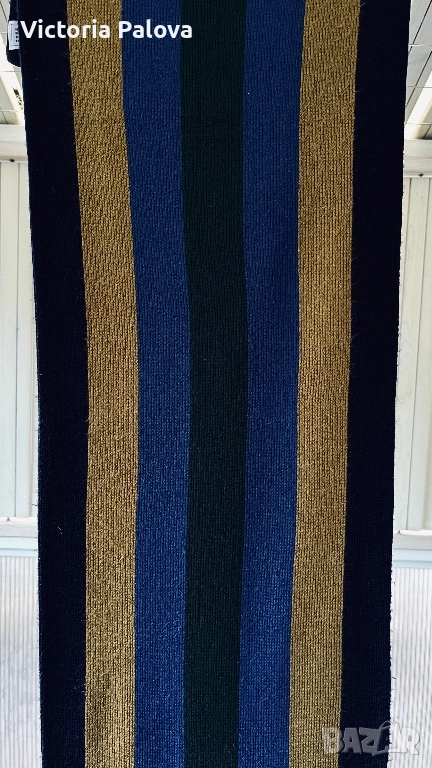Изработен от мека плетена материя със смели вертикални райета в богати нюанси на златисто, тъмносиньо, черно. Размери 166см на 32см - подходящ за завързване в различни стилове. Идеален е за зимен сезон, уютен комфорт без обем - перфектен за ежедневно носене.