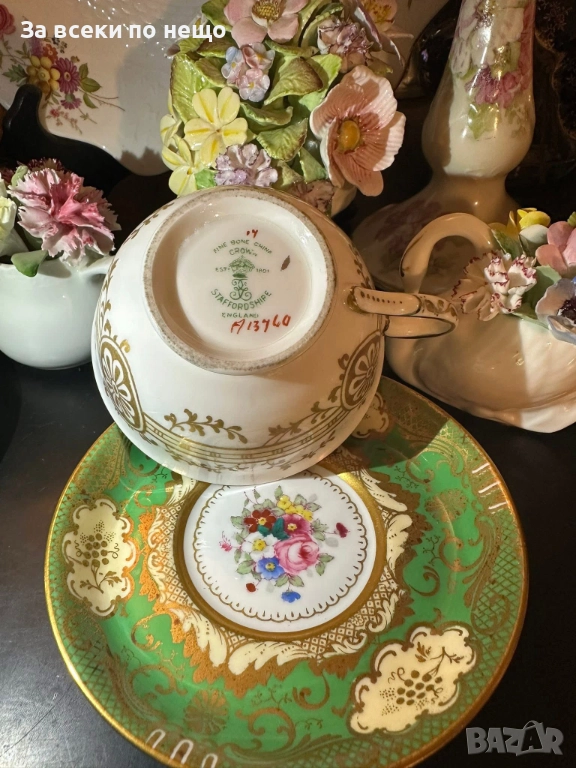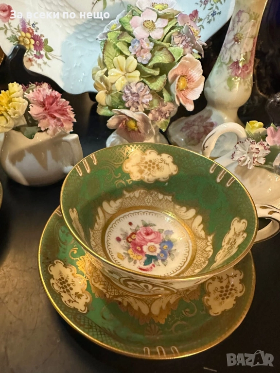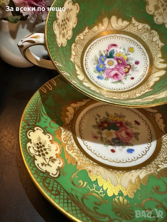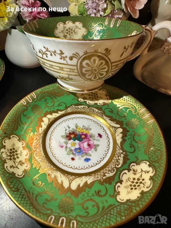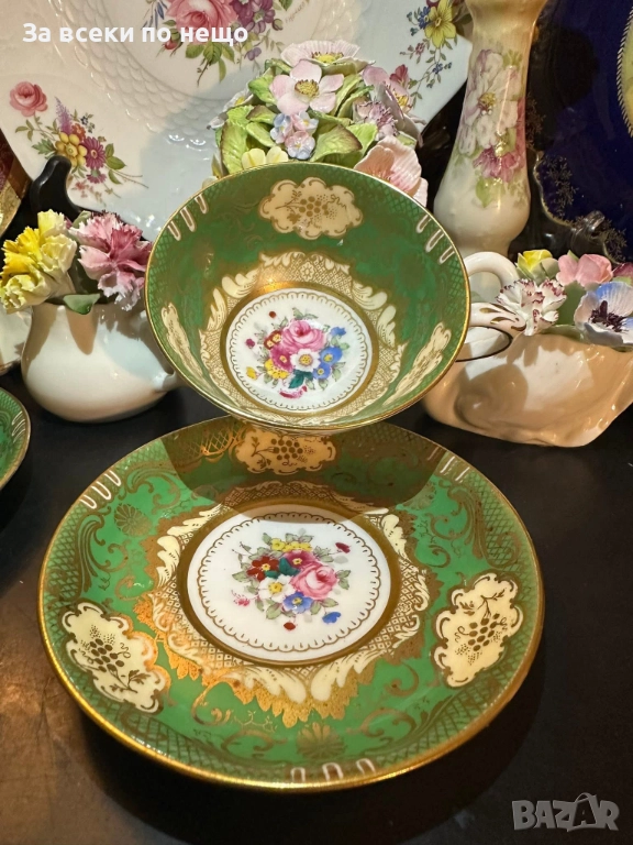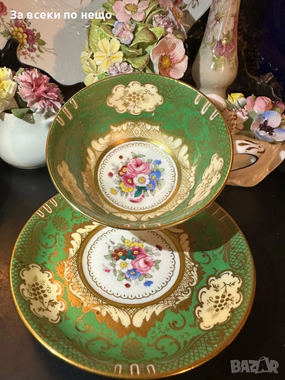 Crown Staffordshire England - Circa 1930 Pattern A 13460 - невероятно красив английски двоен сет, ръчно изрисуван в преобладаващ изумрудено зелен цвят, с много злато и класа, великолепие с цветя и букети, вместимост на чашката 200 мл, изключителна красота и чар, рядък модел и десен, изумително качество и отлично състояние. Ювелирна изработка и супер класа.