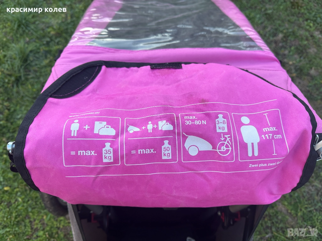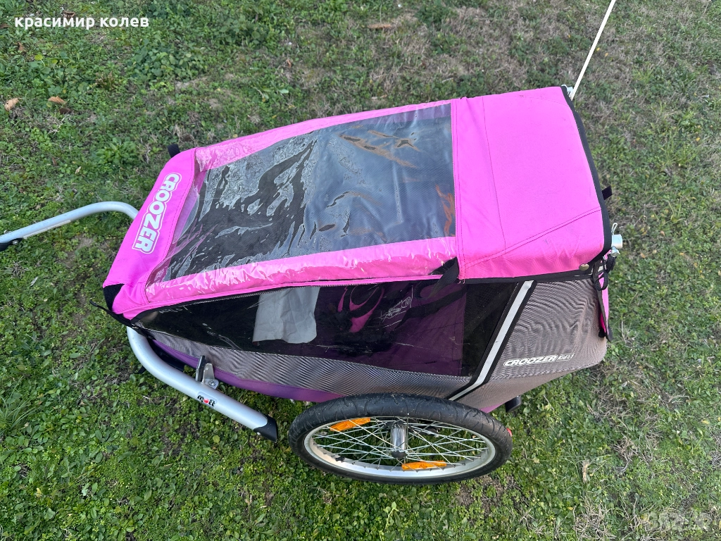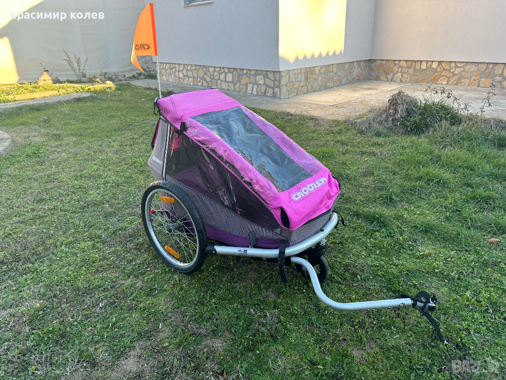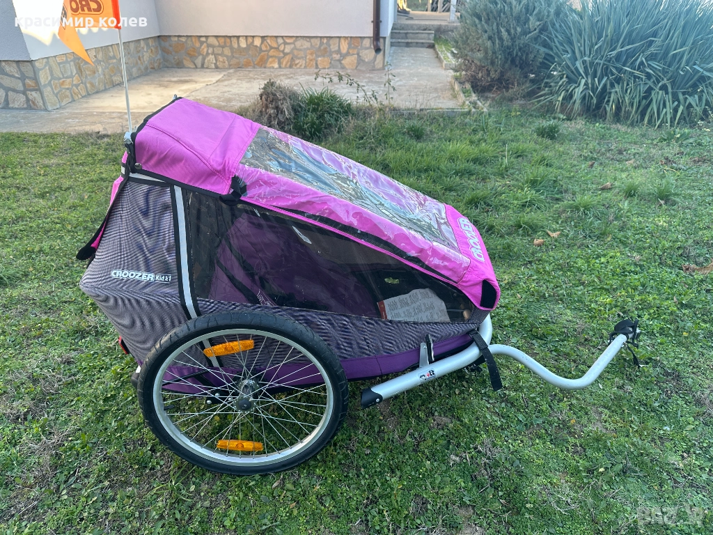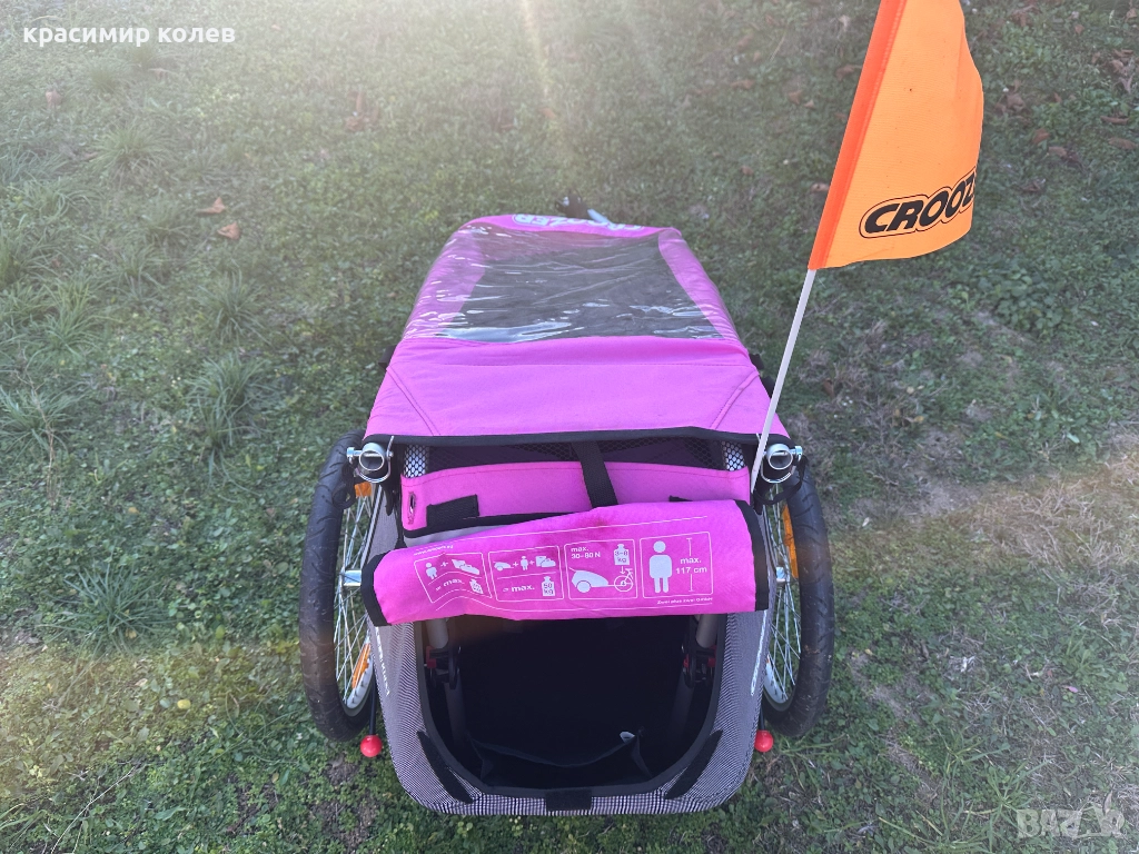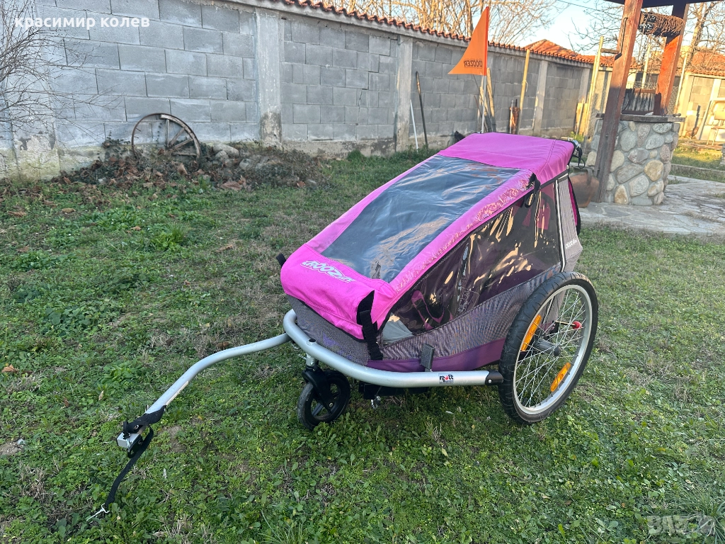 Отлично техническо и визуално състояние.Товароносимост до 50 килограма.Може да се транспортира дете до 117 см.Има багажно отделение.Бързо разглобяване и сглобяване.Стабилно и надеждно ремарке.Пълен комплект , готово за ползване.Единствено дръжката , която се ползва за самостоятелно управление липсва.Бърза връзка за откачане от велосипед.