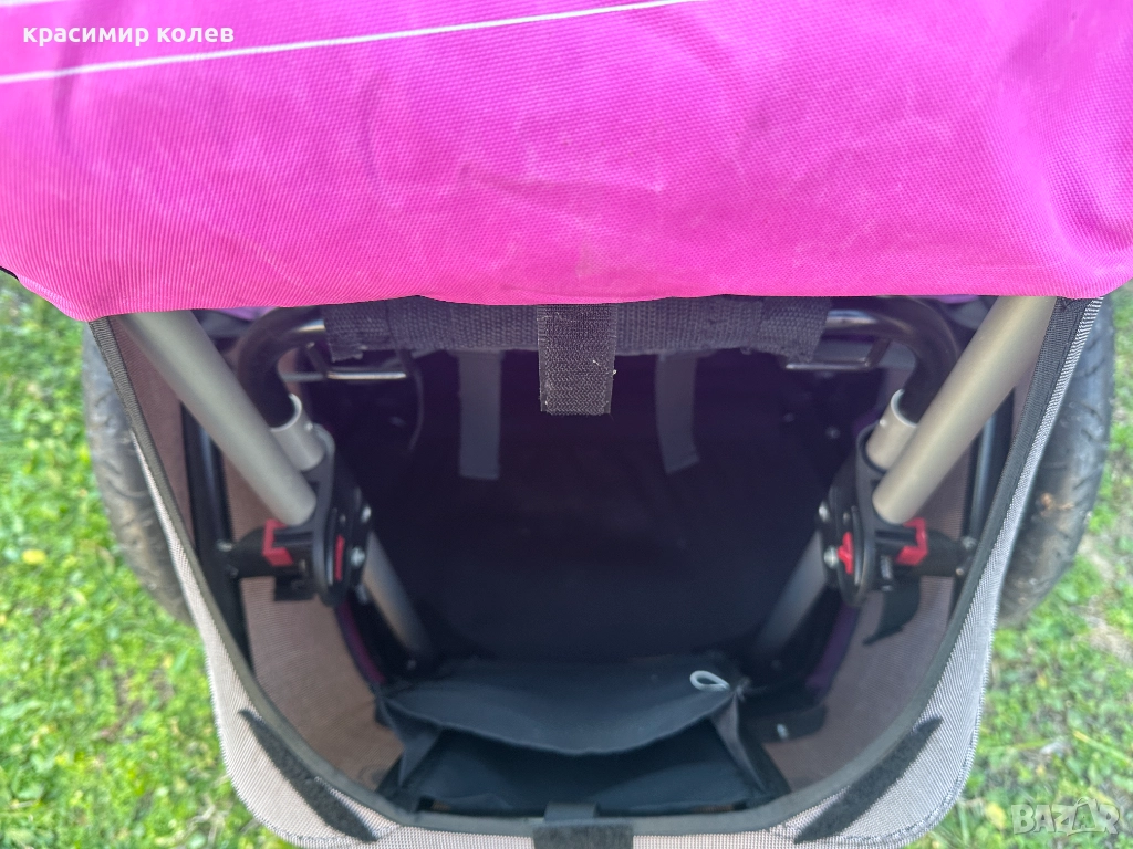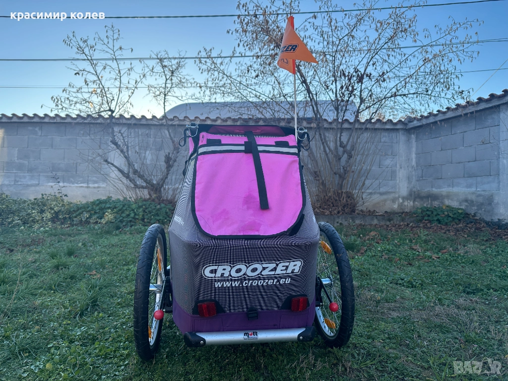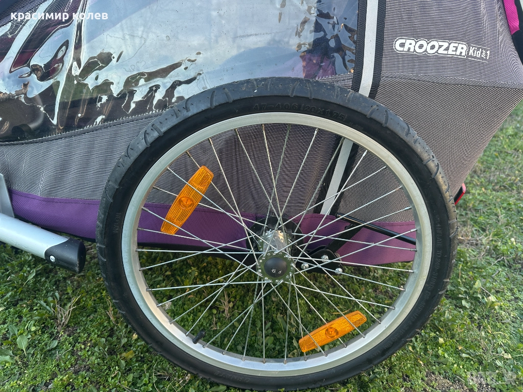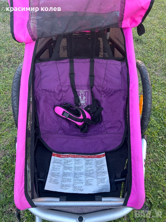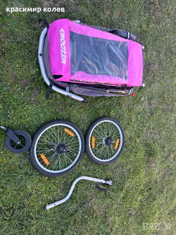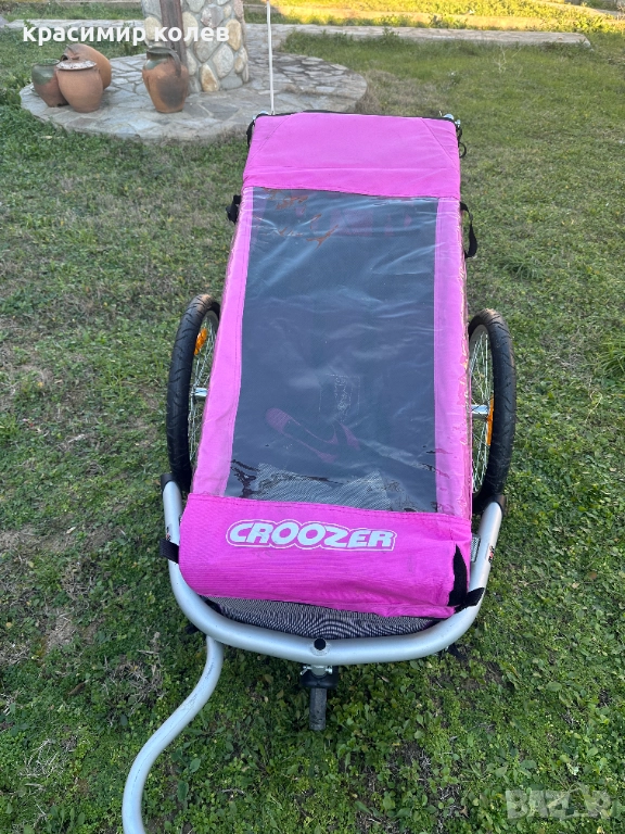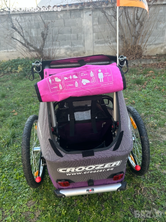 Отлично техническо и визуално състояние.Товароносимост до 50 килограма.Може да се транспортира дете до 117 см.Има багажно отделение.Бързо разглобяване и сглобяване.Стабилно и надеждно ремарке.Пълен комплект , готово за ползване.Единствено дръжката , която се ползва за самостоятелно управление липсва.Бърза връзка за откачане от велосипед.
