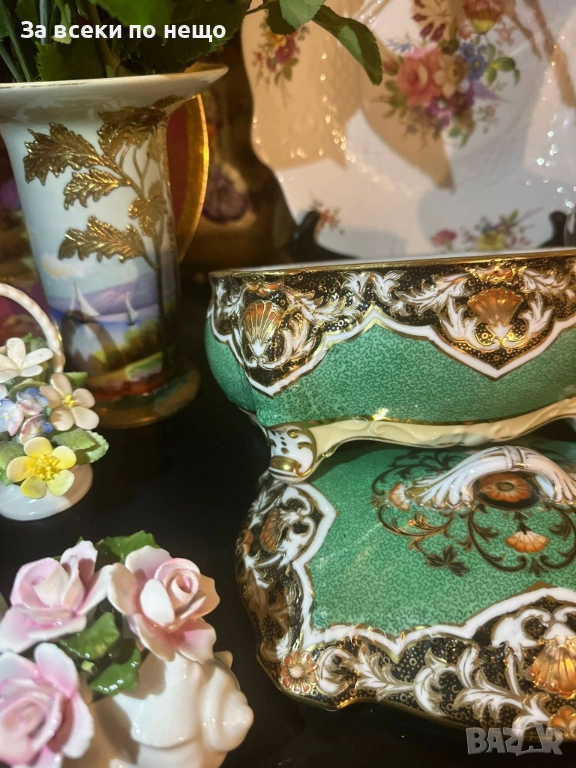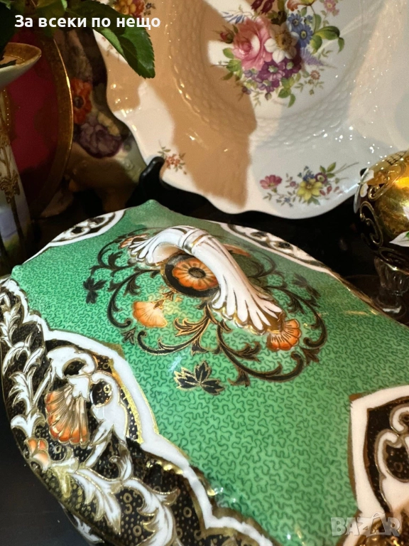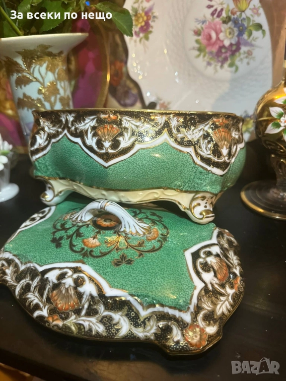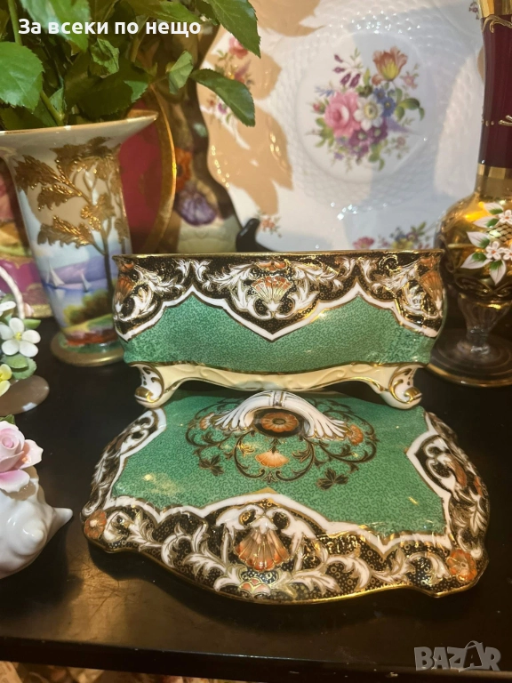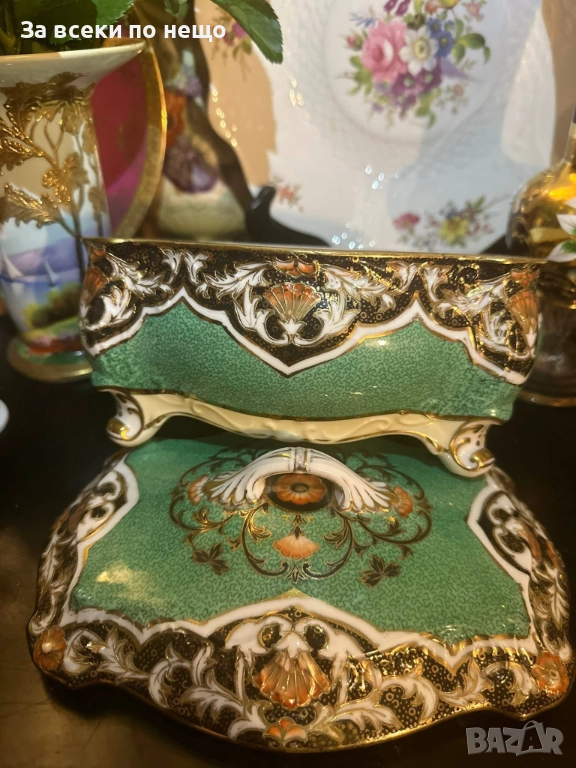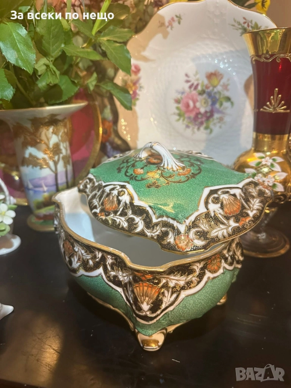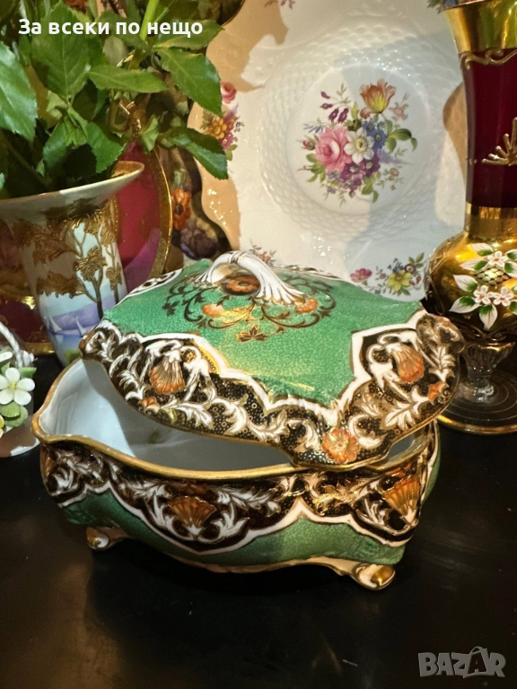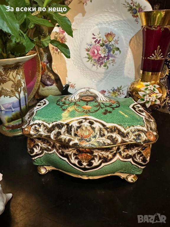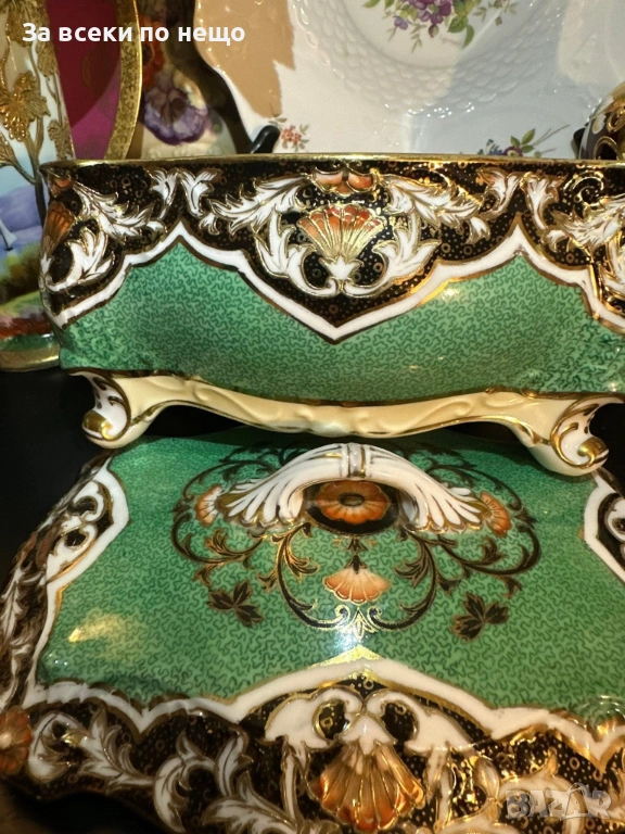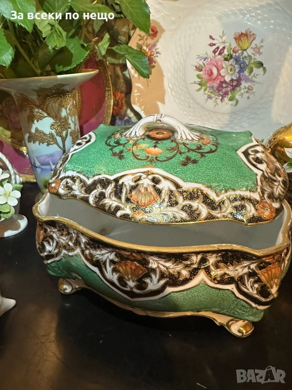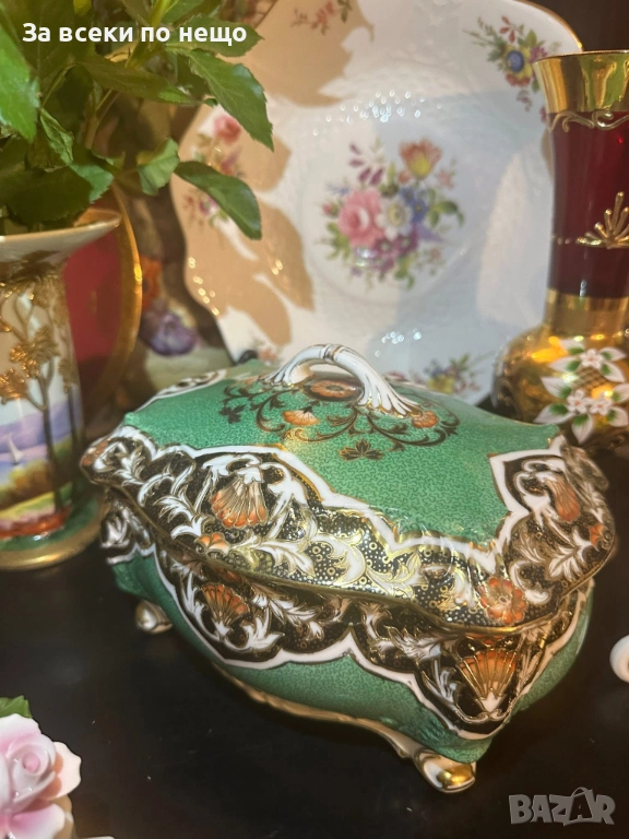 Circa 1908 “ Императорската кутия” невероятно красив и грандиозен съд на четири крака, в зелено и злато, великолепна архитектура и ръчно нарисувано “Бижу” от началото на 20 век, размери 20/15/14 см, уникална красота и наистина ценно и много рядко откриваемо произведение на източното порцеланово изкуство с отлично качество и състояние. Неподражаемо порцеланово “бижу”!