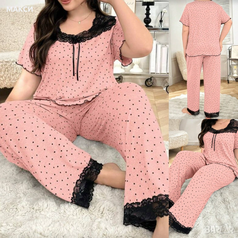 Макси чудесен силно еластичен и мек комплект/пижама/ с красива бяла дантела- тениска + долнище с лас