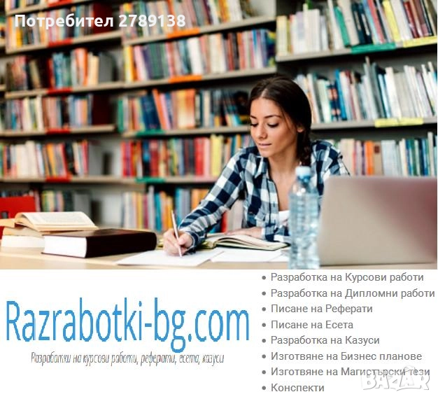 - малка част от областите, в които пишем: Икономика и управление; Маркетинг; Реклама; Европейски съюз; Стопанско управление; Публична администрация; Счетоводство; Статистика и иконометрия; Финанси; Туризъм; Политология; Социология; Педагогика (ПКС; разработване на план-конспекти); Теми за завършващ етап в 12 клас на професионалните гимназии в България и много други.
