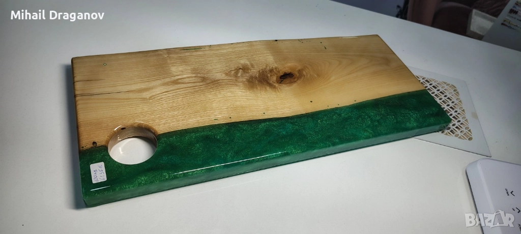 Здравейте. Представям ви ръчно изработена дъска за сервиране, изработена от дърво (ясен) и епоксидна смола.