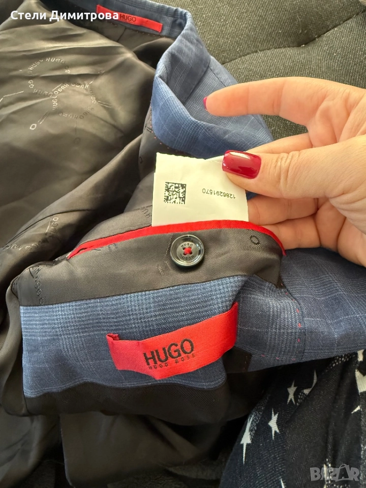 Сако Hugo Boss в размер EU94 (размер M), в син цвят. Носено е много малко пъти,защото бързо стана малко.Оригинално е ,абсолютно здраво,оригинално 100%,размер М,изпращам с преглед и тест чрез Еконт или Спиди.За гр.Пловдив с лично предаване