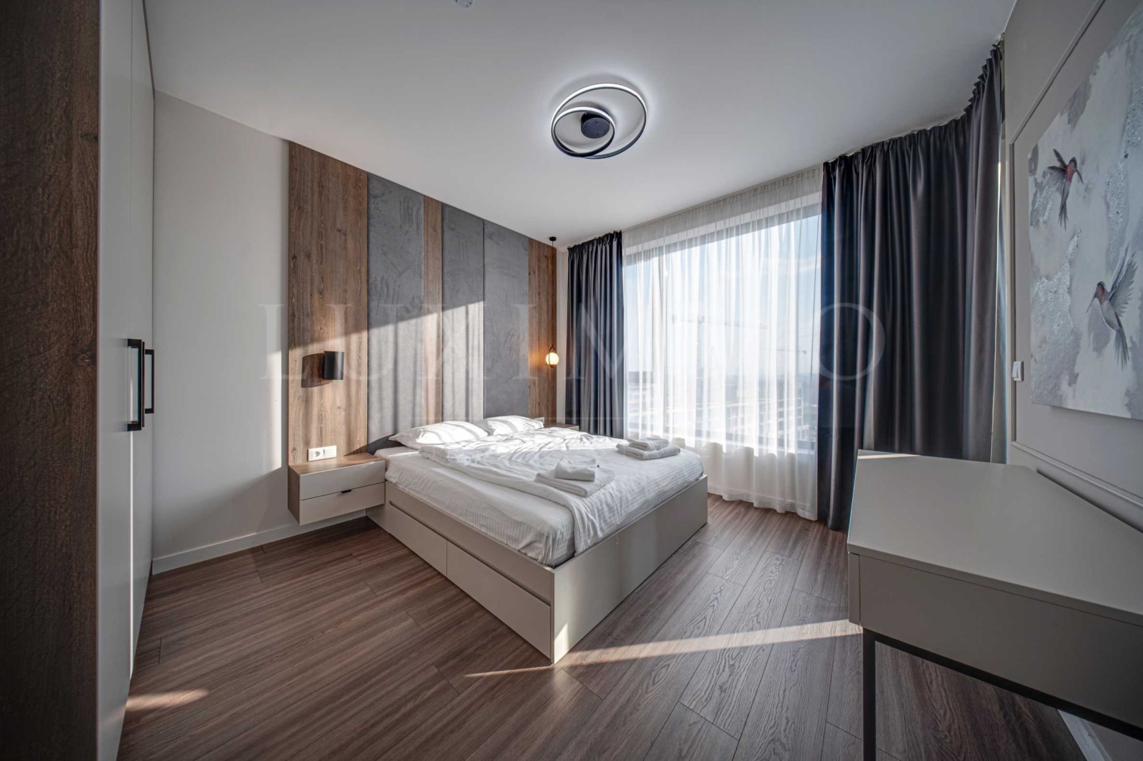 Жилището е светло, просторно и с изключително функционален дизайн, изпълнено е със съвременни интериорни решения, в топли и меки цветове, създаващи усещане за уют, спокойствие и комфорт. Обзавеждането и оборудването са първокласни, с нови висококачествени мебели и електроуреди от последно поколение, осигуряващи безпроблемно и приятно ежедневие.