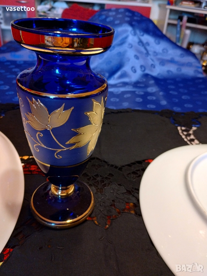 4 Ваза от кобалтово синьо стъкло с апликации от златен варак 21 см. 20 лв.