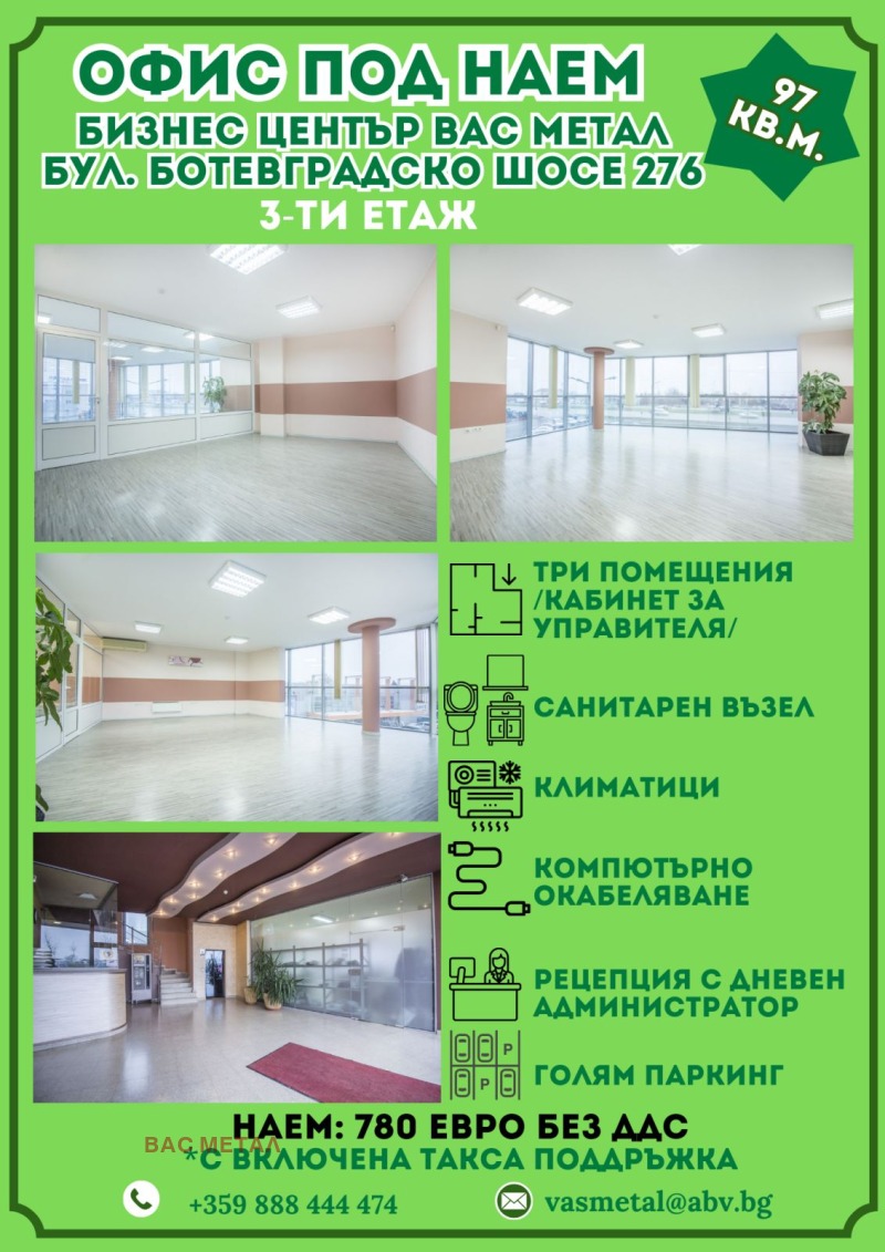 Предлагаме офис под наем, разположен в утвърден бизнес център VAS Metal, на бул. Ботевградско шосе 276. Локацията осигурява удобен и бърз достъп, както с автомобил, така и с градски транспорт, което прави имота практичен избор за ежедневна офисна дейност.