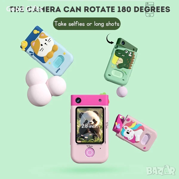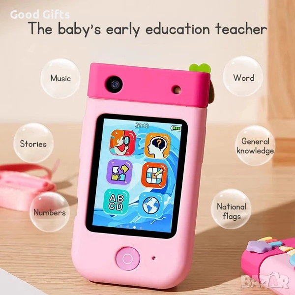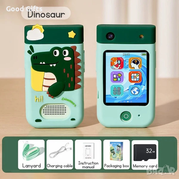 Интерактивен детски смартфон с 2.8" сензорен екран, 180° въртяща се камера, образователни игри, музика и практични функции. Създаден да забавлява, обучава и развива умения, без рисковете на истински смартфон.