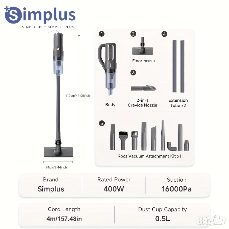 Прахосмукачка с Кабел 2 в 1 Simplus – Ръчна и Вертикална, 16000PA, 400W, HEPA Филтрация!