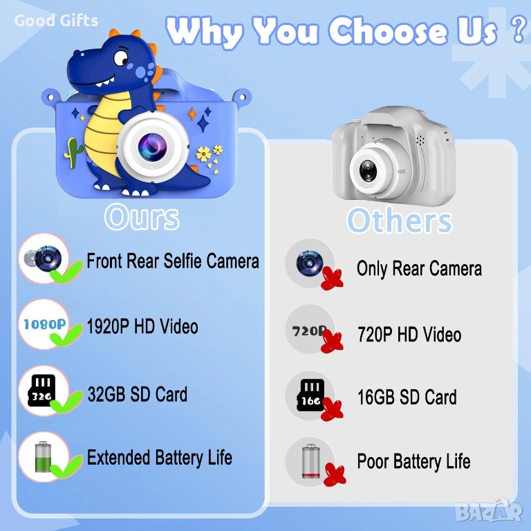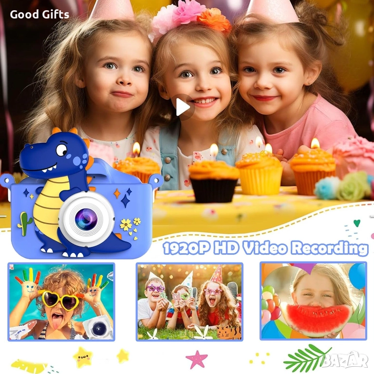 Тази детска дигитална камера с дизайн на динозавър е създадена специално за малките изследователи. Оборудвана е с двойна камера (предна и задна) с висока резолюция до 48MP, което позволява лесно заснемане на селфита, снимки и видеа с отлично качество.