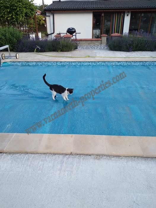 Напълно ограден имот с паркинг, плувен басейн 4x8 м и достатъчно място за градинарство и събирания на открито. Жилищната площ е 190 кв.м, а двора е 1080 кв.м. Приземният етаж се състои от входно антре, тоалетна за гости, отделна кухня и просторна всекидневна с камина. Трапезарията се отваря директно към градината с басейн, създавайки плавен преход между вътрешен и външен живот. Светла зимна градина също се отваря към градината, осигурявайки открито и просторно изживяване дори през по-хладните месеци. Този етаж включва и втора баня с тоалетна, която в момента е недовършена, но може лесно да бъде завършена. Особен акцент е мазето от приблизително 50 кв.м (не е включено в изчислението за жилищна площ), обзаведено като традиционна кръчма с