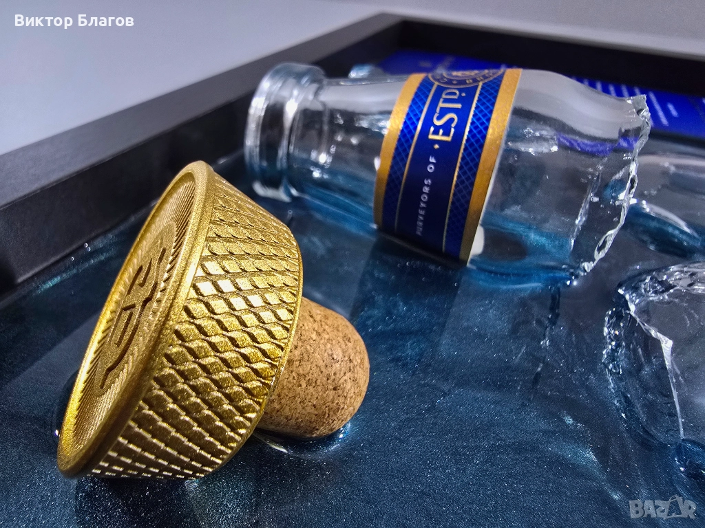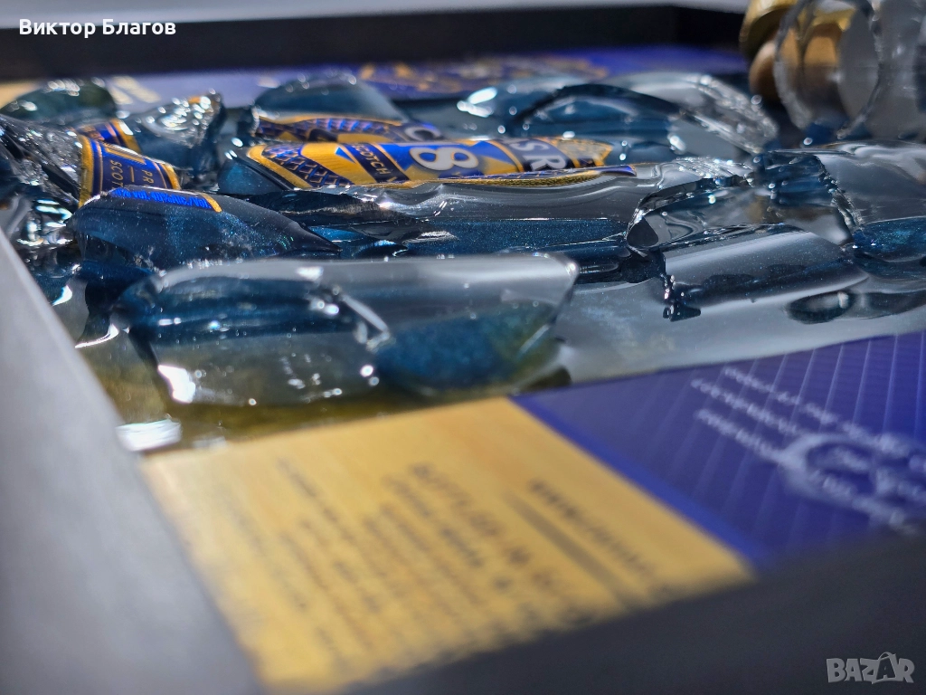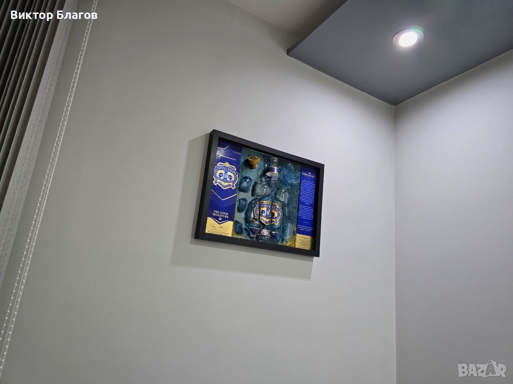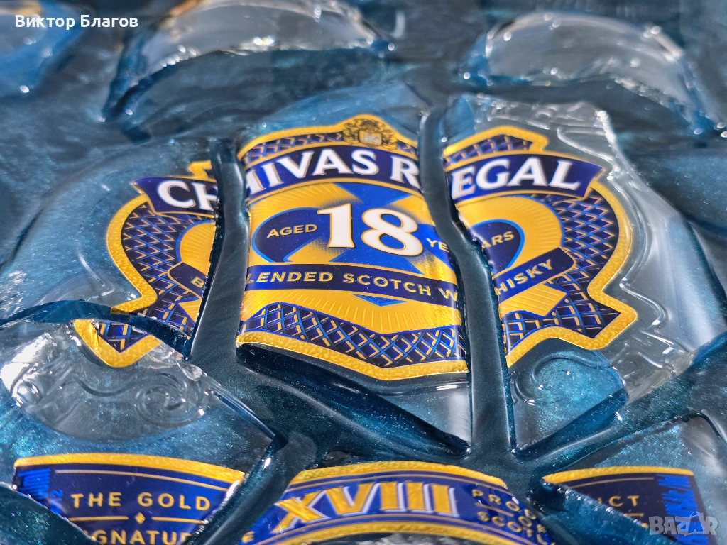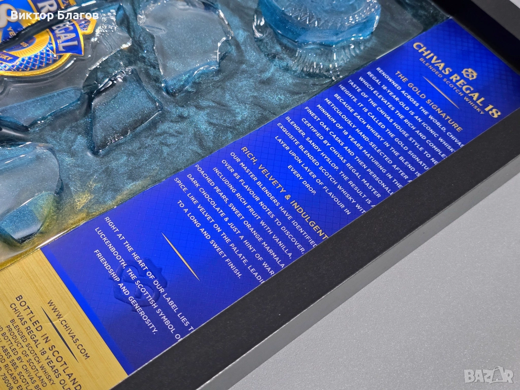 3D картина с натрошена уиски бутилка Chivas Regal 18 в епоксидна смола със син перлен пигмент. Част от оригиналната кутия за съхранение е отрязана и сложена заедно с бутилката в картината.