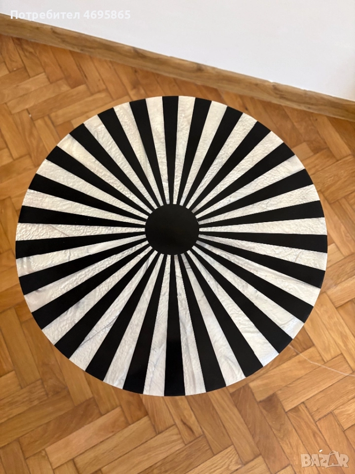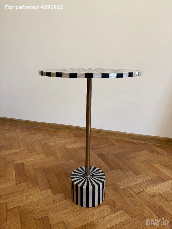 Дизайнерска масичка в бяло, черно и златно. Подходяща за добавка към всякакъв интериор, както и самостоятелно за кафе. Размерите са: височина 55см, диаметър 37см